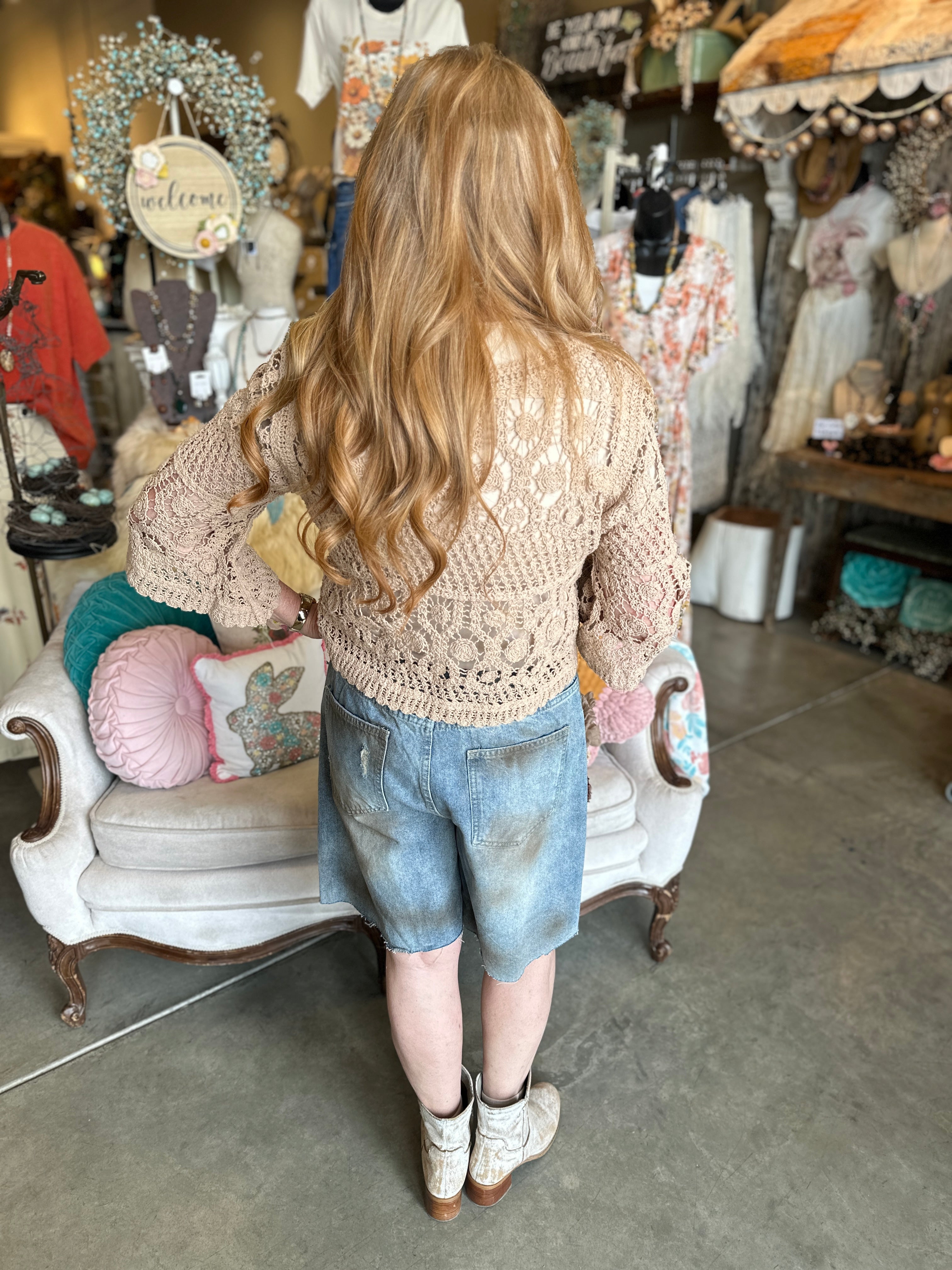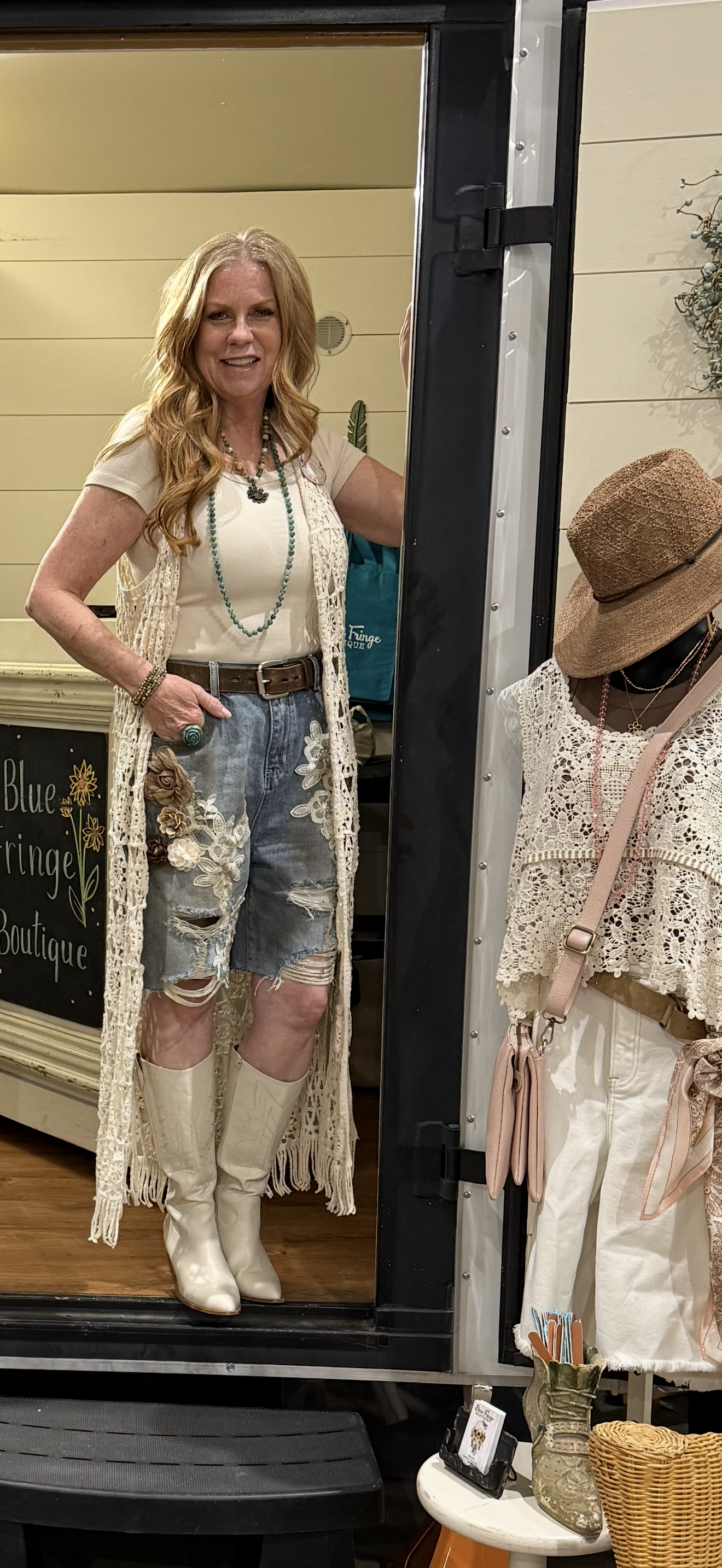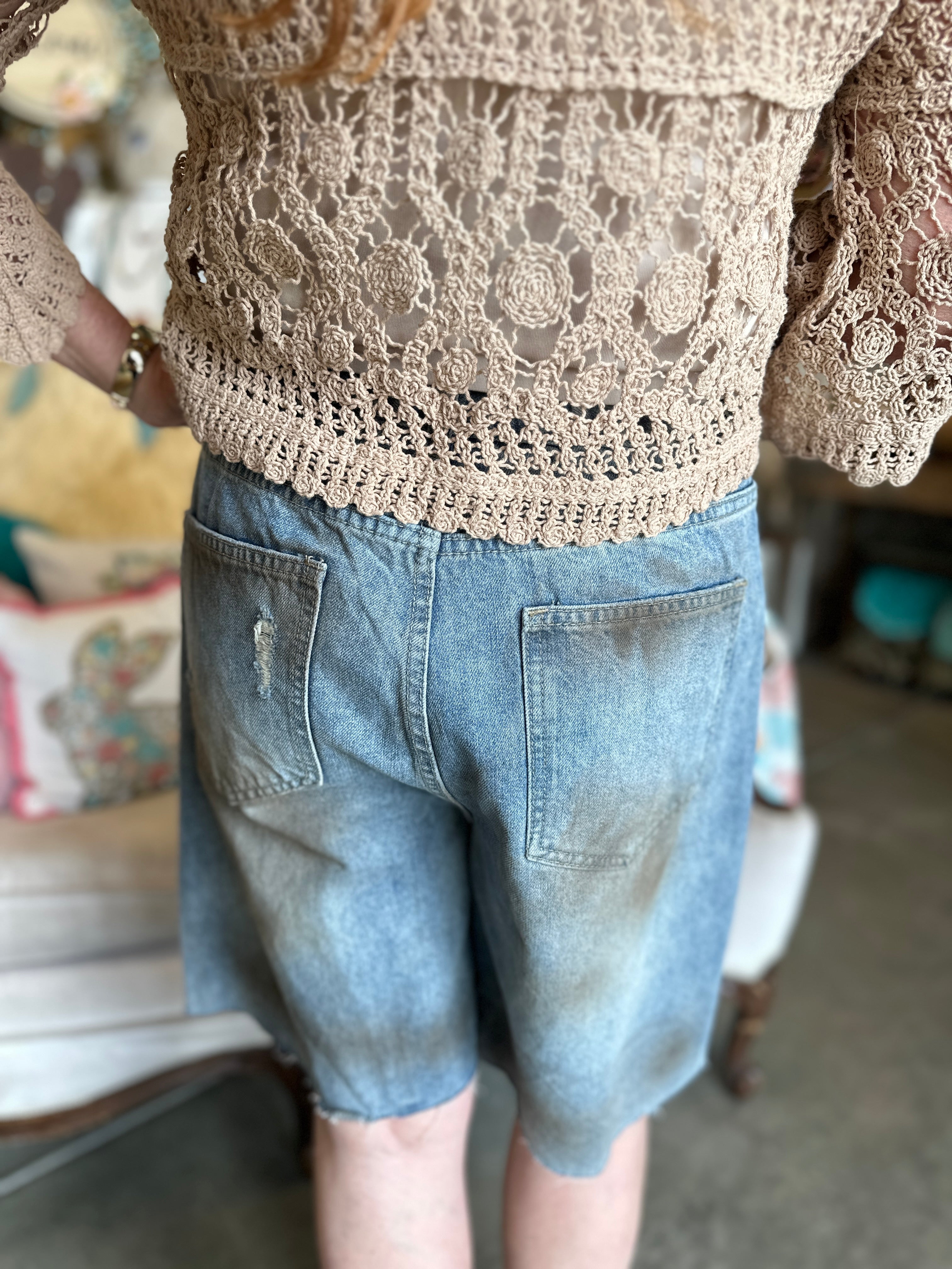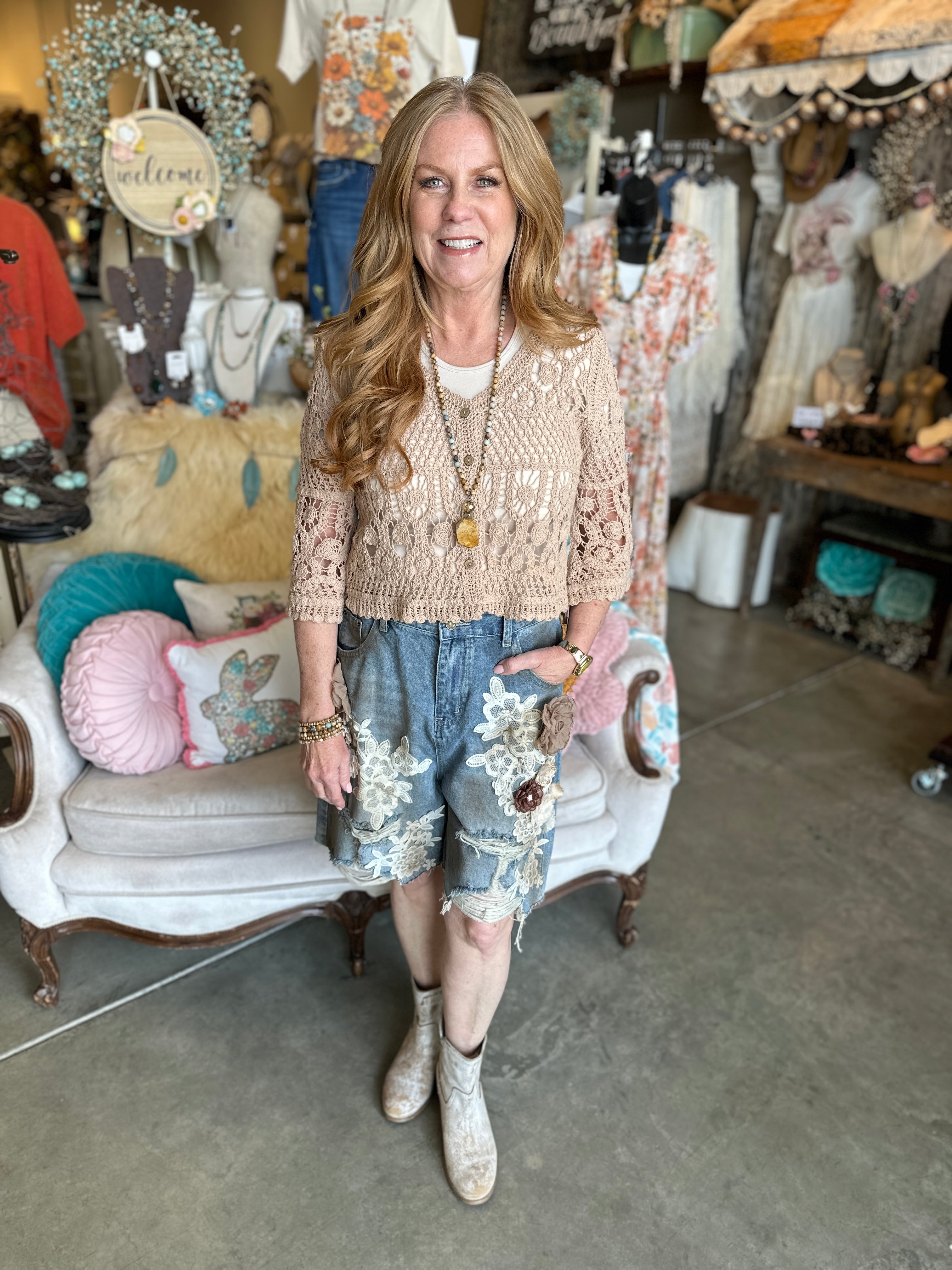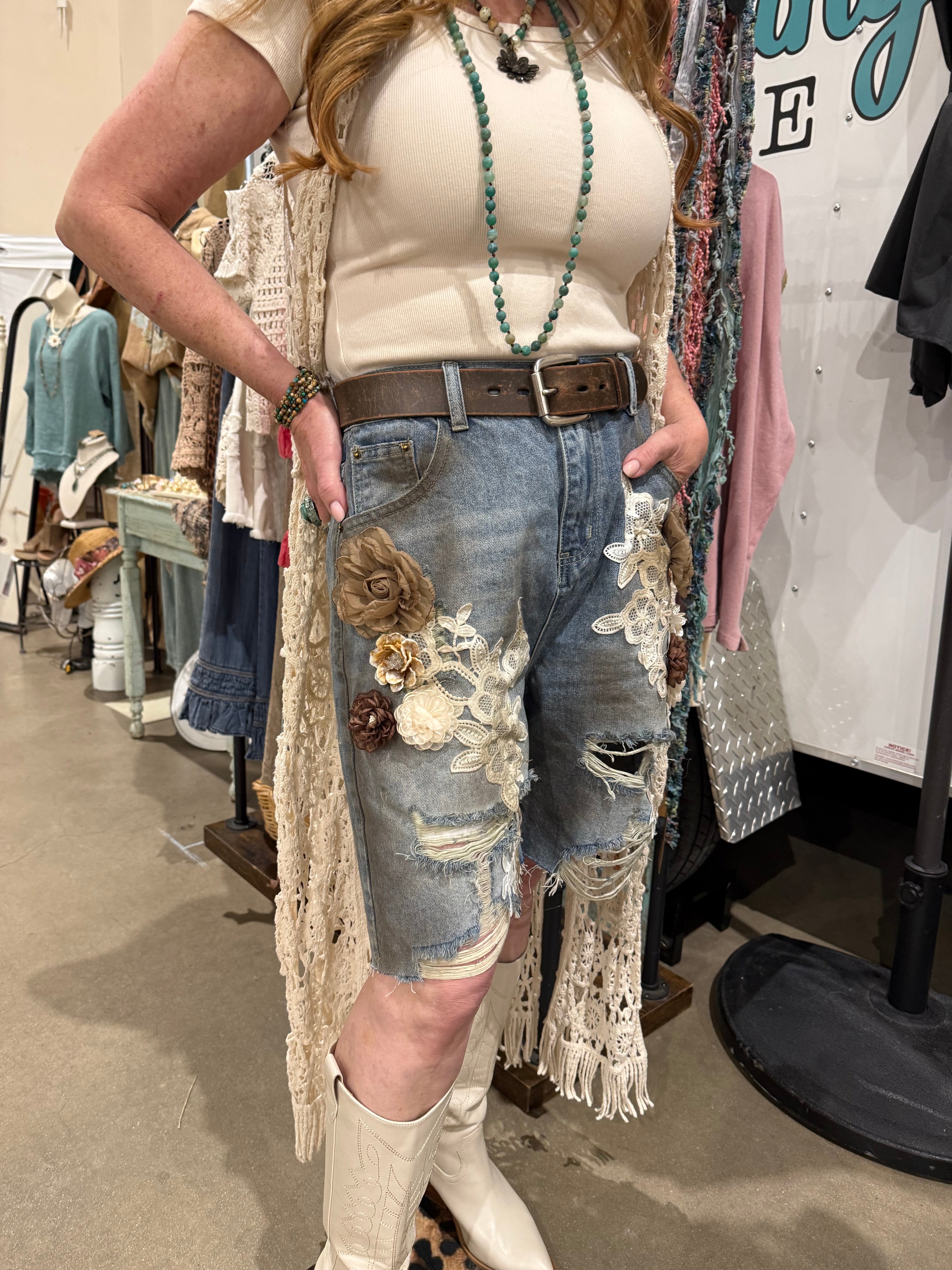 Embrace your free-spirited style with these All Laced Up Shorts—a boho essential that turns heads. Crafted from distressed denim, they feature delicate lace and crochet accents paired with charming floral details for that effortless bohemian vibe. The elastic back waist ensures comfort while you make your statement. Perfect for festival season, casual outings, or whenever you want to channel laid-back, artistic energy. This is the piece that says you don't follow trends—you create them.