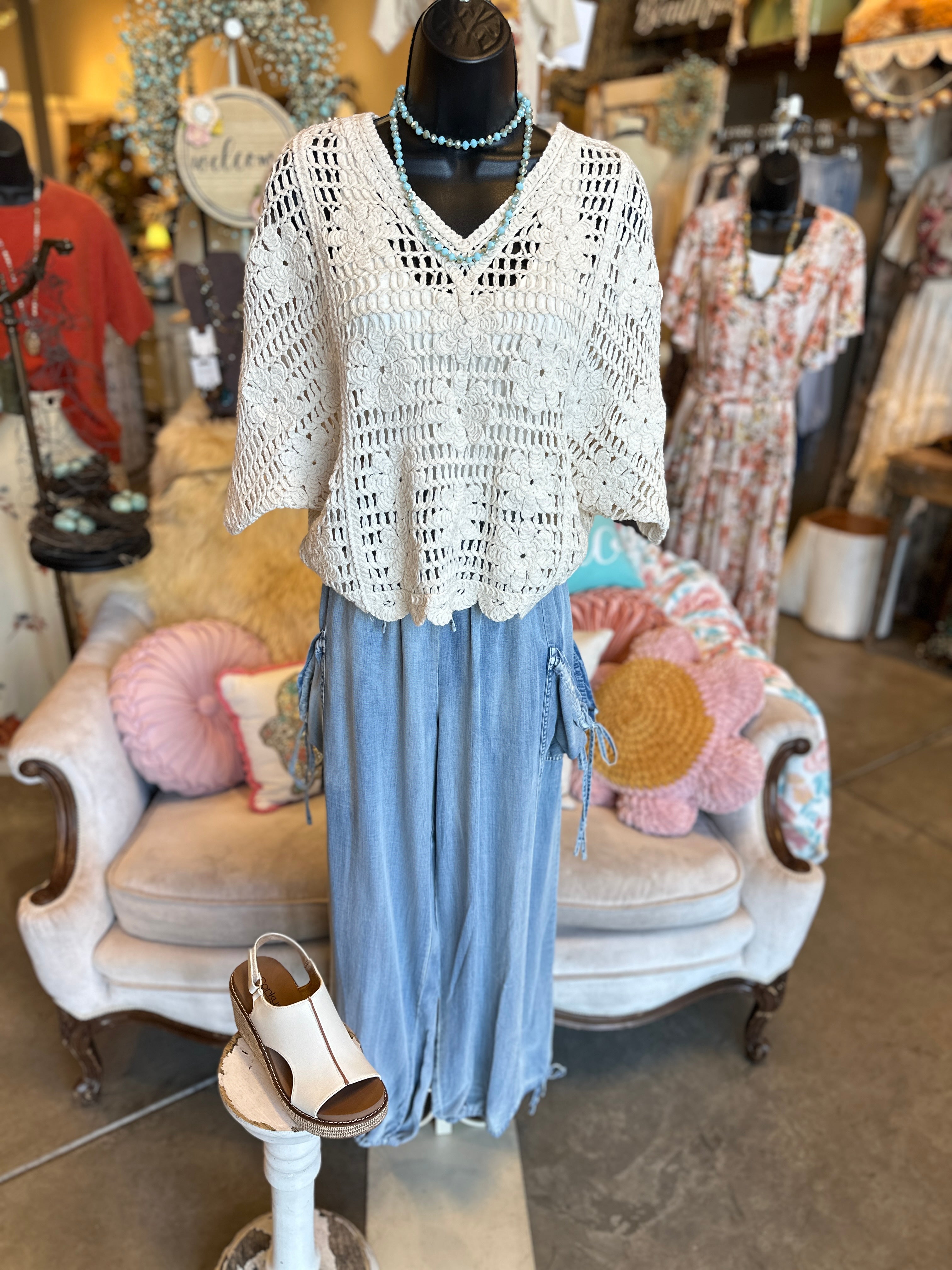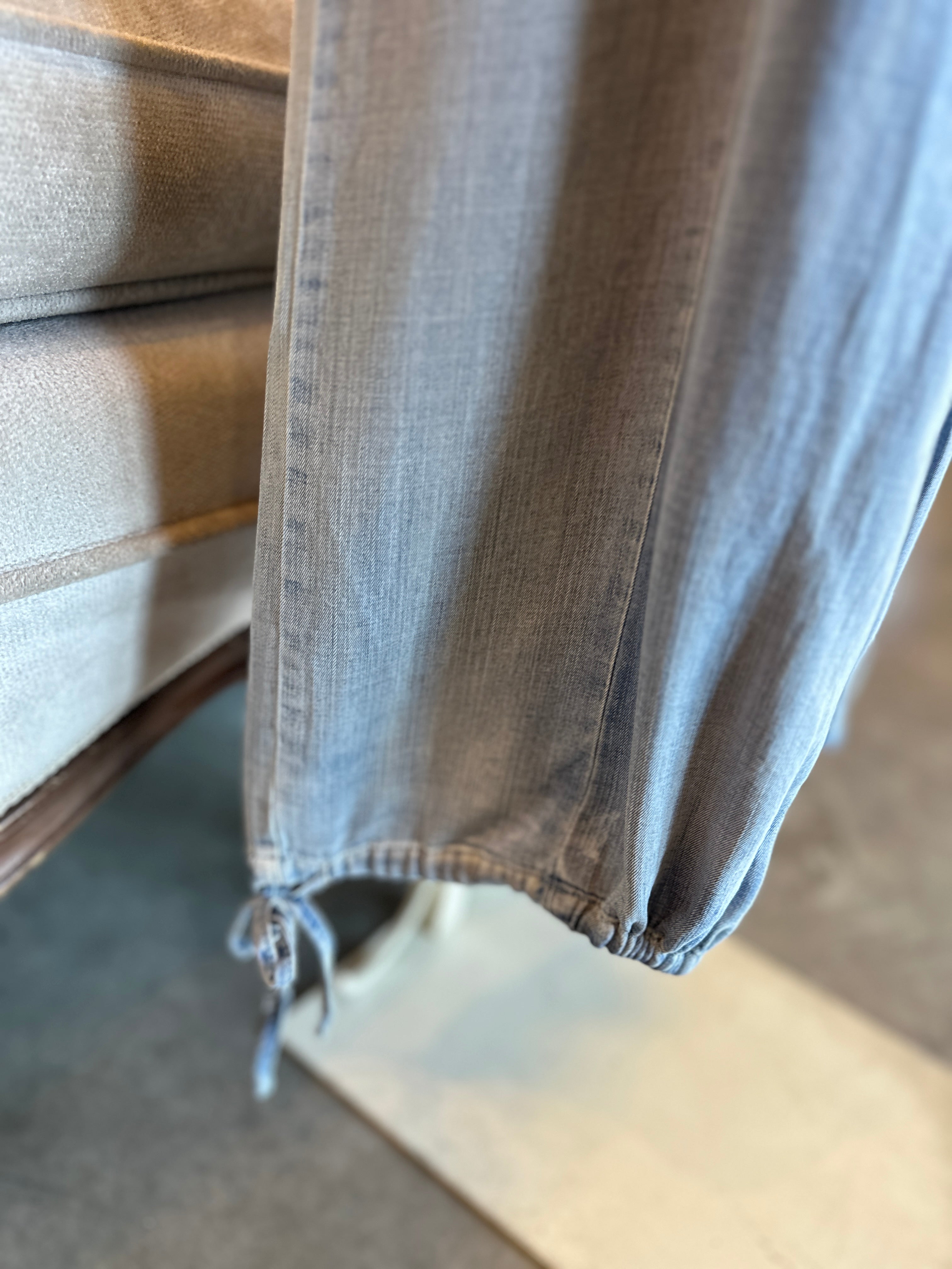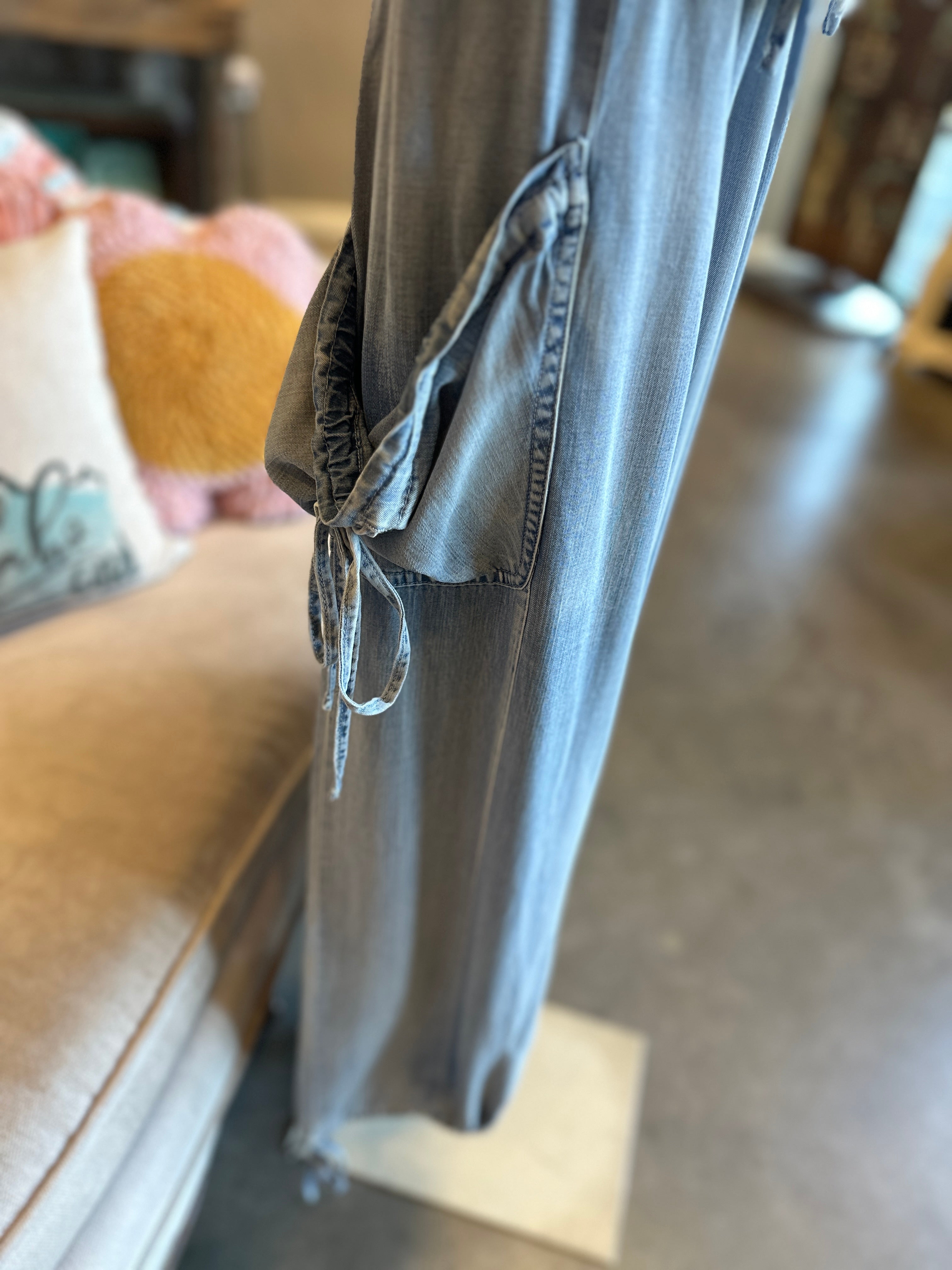 Effortless style meets thoughtful design in these soft chambray pants. Featuring a flattering elastic waist with drawstring tie, cinched side pockets, and a playful tie detail at the hem, they're packed with charming touches that set them apart. Perfect for casual days when you want comfort without sacrificing personality.