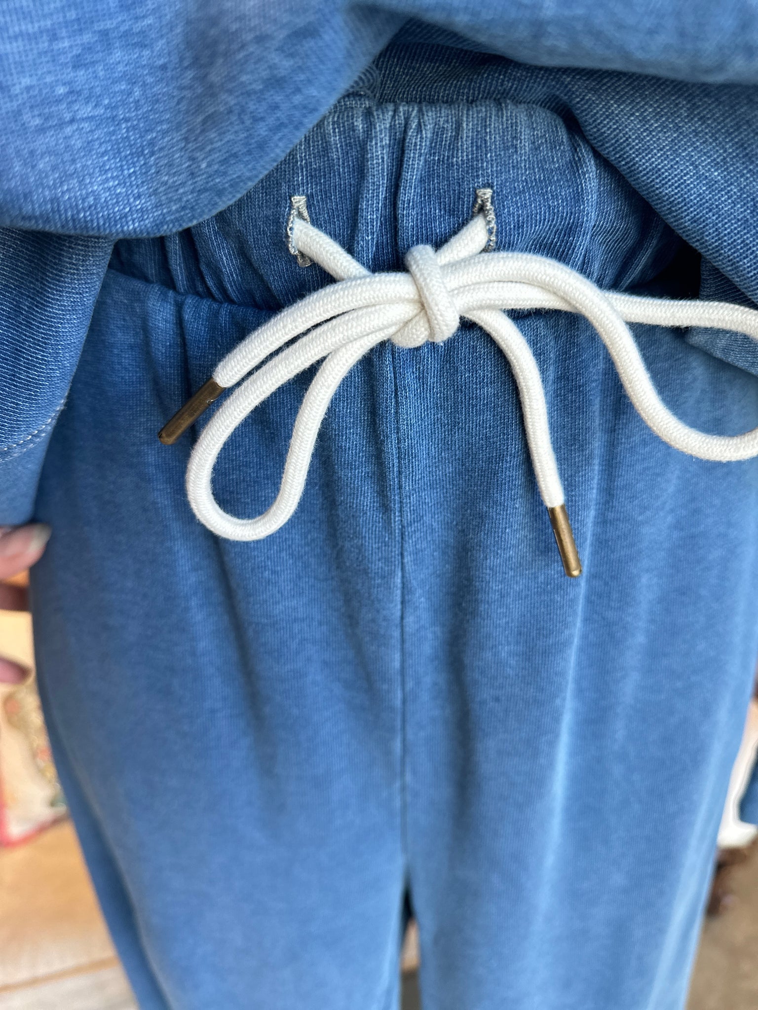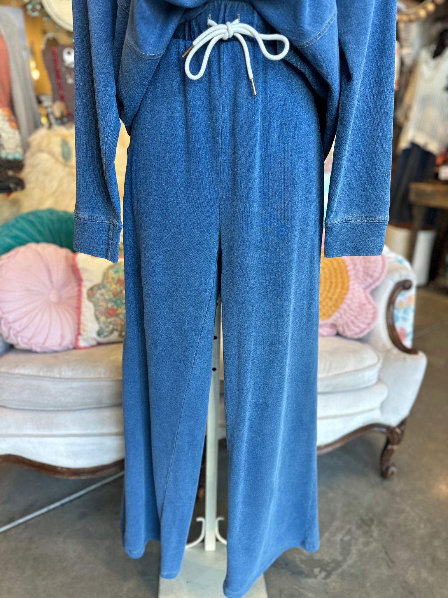 Effortless comfort meets versatile style with this denim blue terry knit set. The matching top and bottoms feature a soft, breathable fabric perfect for lounging or everyday wear. Elastic waist with drawstring and functional front pockets on the bottoms provide practical comfort. Dress it down for cozy days at home or layer and accessorize to elevate your look for outings. A go-to piece that transitions seamlessly from casual to polished.