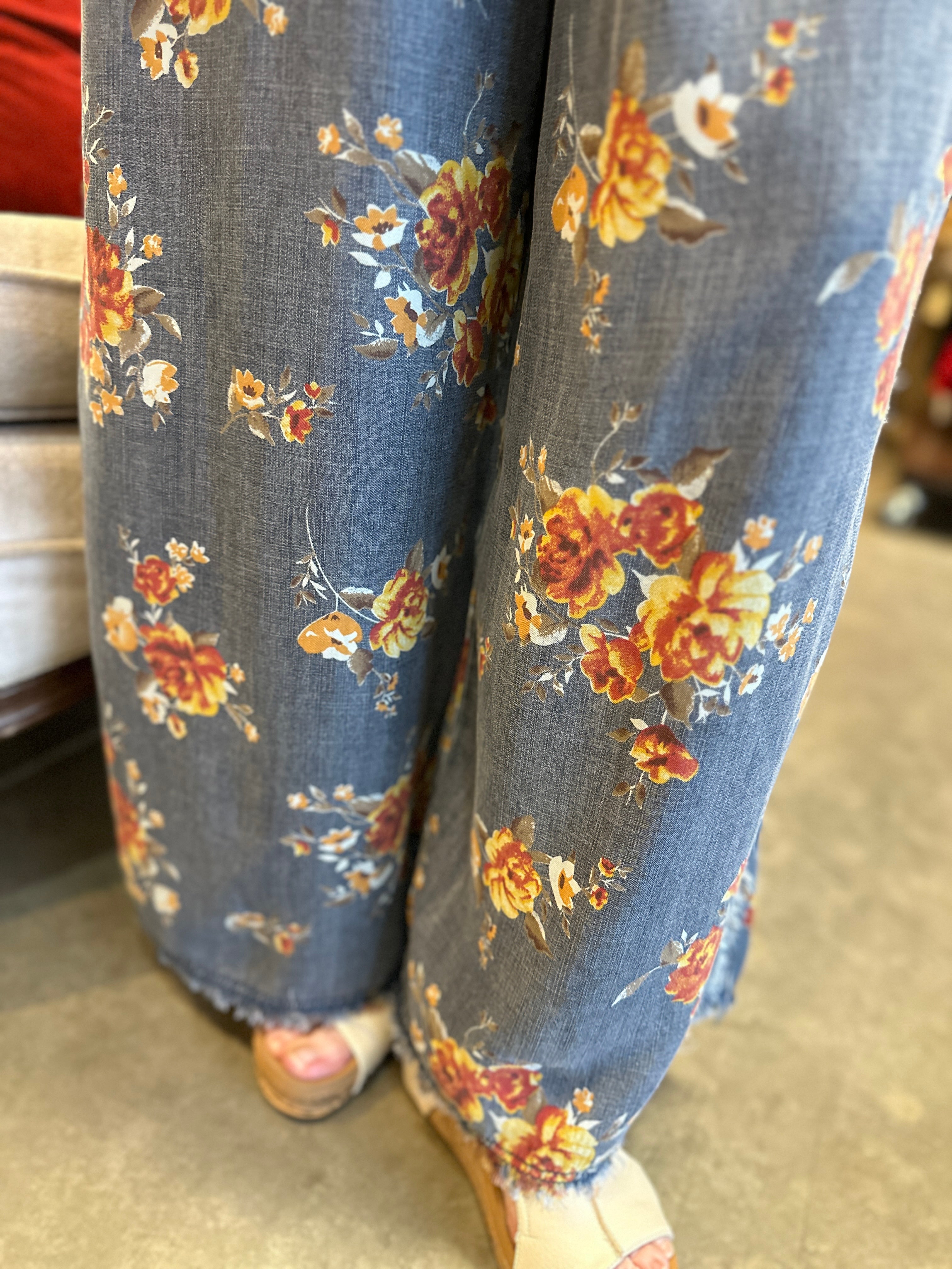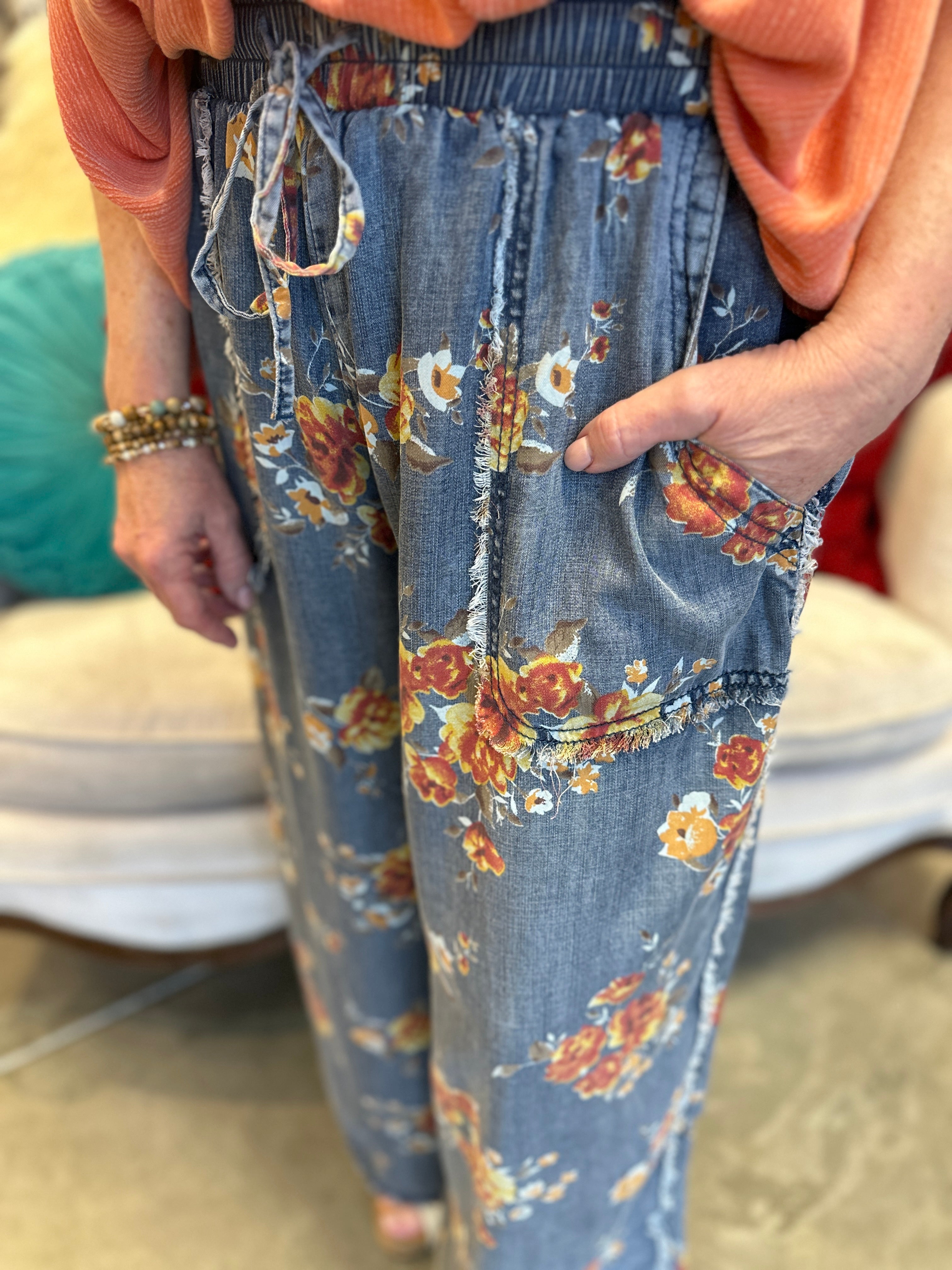 Embrace effortless style with these Floral Washed Denim Pants from Easel, featuring a whimsical floral print that sets them apart. The relaxed loose fit offers all-day comfort, while the elastic waist with drawstring ensures an adjustable, secure fit. Practical front pockets and a playful frayed hem add character to this unique piece. Crafted with a luxuriously soft Tencel-like fabric, these pants deliver a smooth, breathable feel perfect for casual wear that doesn't compromise on comfort or personality.
