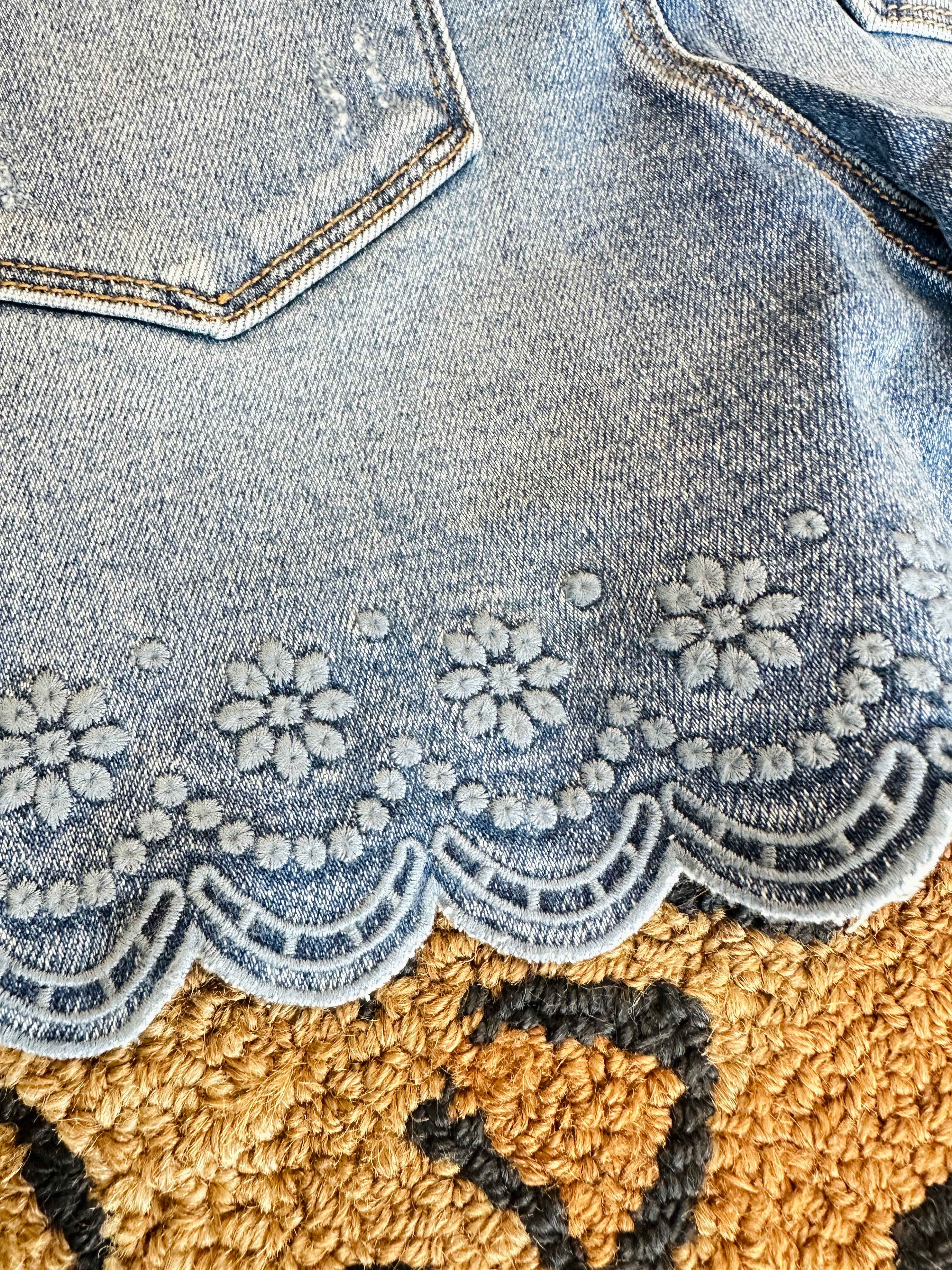 Risen High Rise Daisy Scallop Hem Shorts bring playful charm to your everyday wardrobe. Crafted from a comfortable cotton, poly, and lycra blend, these shorts feature a flattering high-rise fit with a distinctive scalloped hemline adorned with delicate daisy details. The 4" inseam offers a modern, versatile length, while the medium wash adds subtle character. Perfect for those who want to elevate their denim game with unique, statement-making pieces that don't compromise on comfort or style. Daisy Dukes next level.