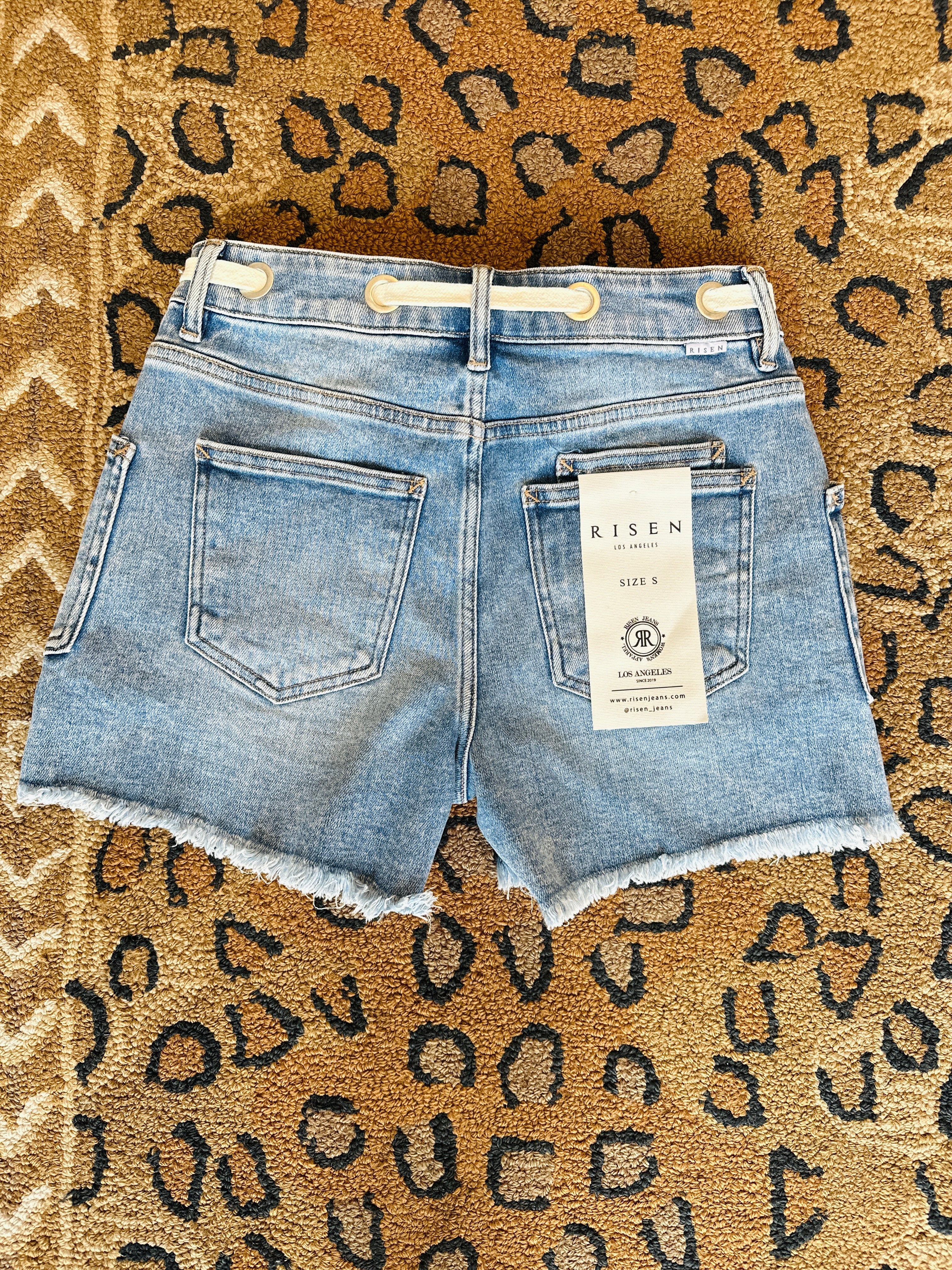 Effortless summer style meets comfort in this Risen light wash denim short. Designed with a flattering 4" inseam, it features a unique patch pocket and an eyelet belt detail that adds a touch of sophistication. The fringed hem brings casual edge, while the comfort stretch cotton, poly, and lycra blend ensures all-day wearability. Perfect for warm-weather dressing.