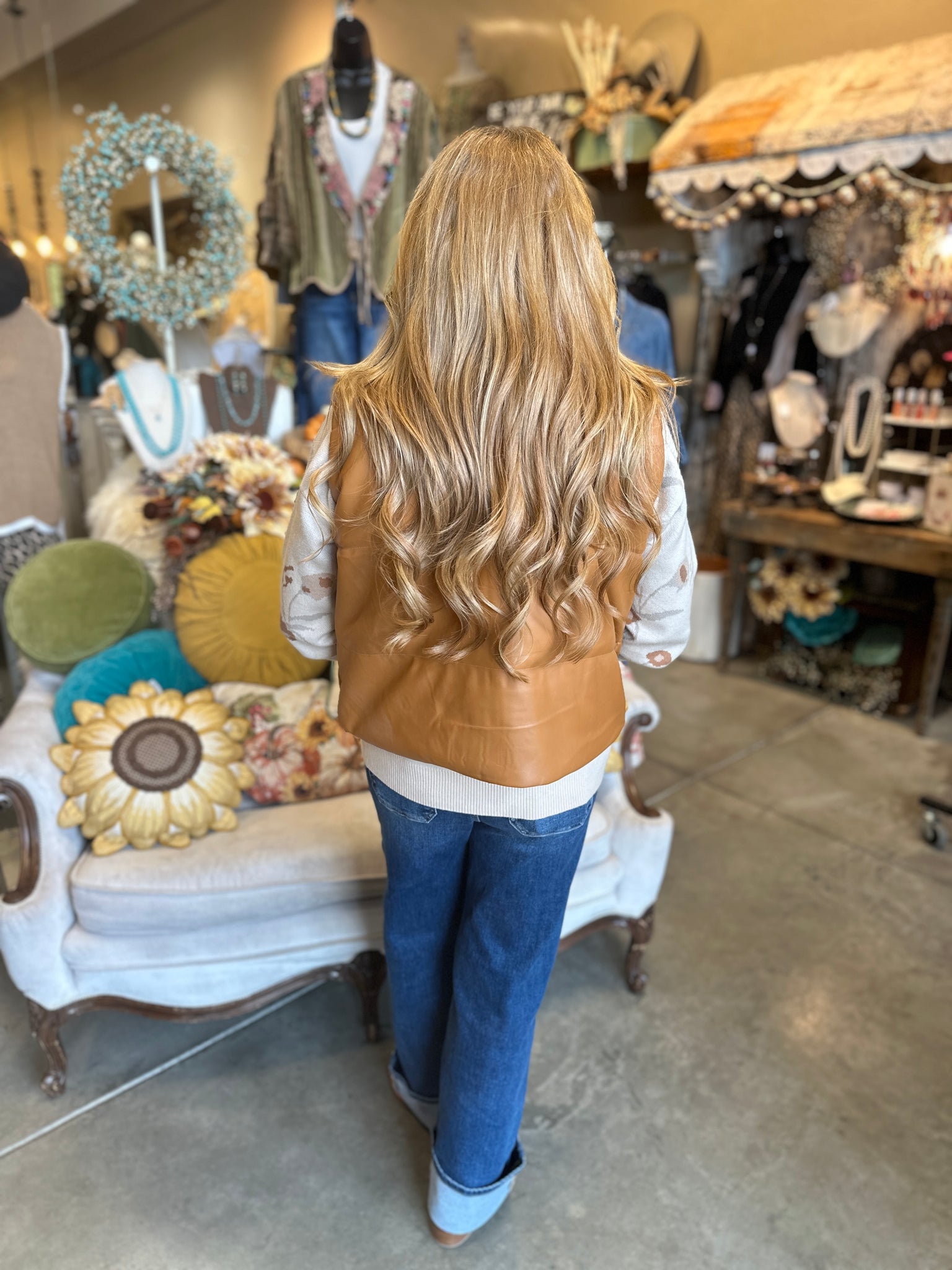 Make a bold impression with this camel-colored pleather puffy vest. Its sleek texture and striking silhouette create a statement piece that elevates any outfit. Perfect for layering, it adds edge and warmth to your look while expressing fearless style.