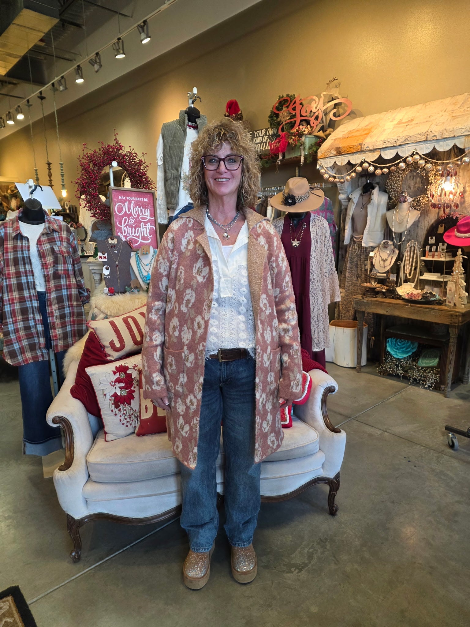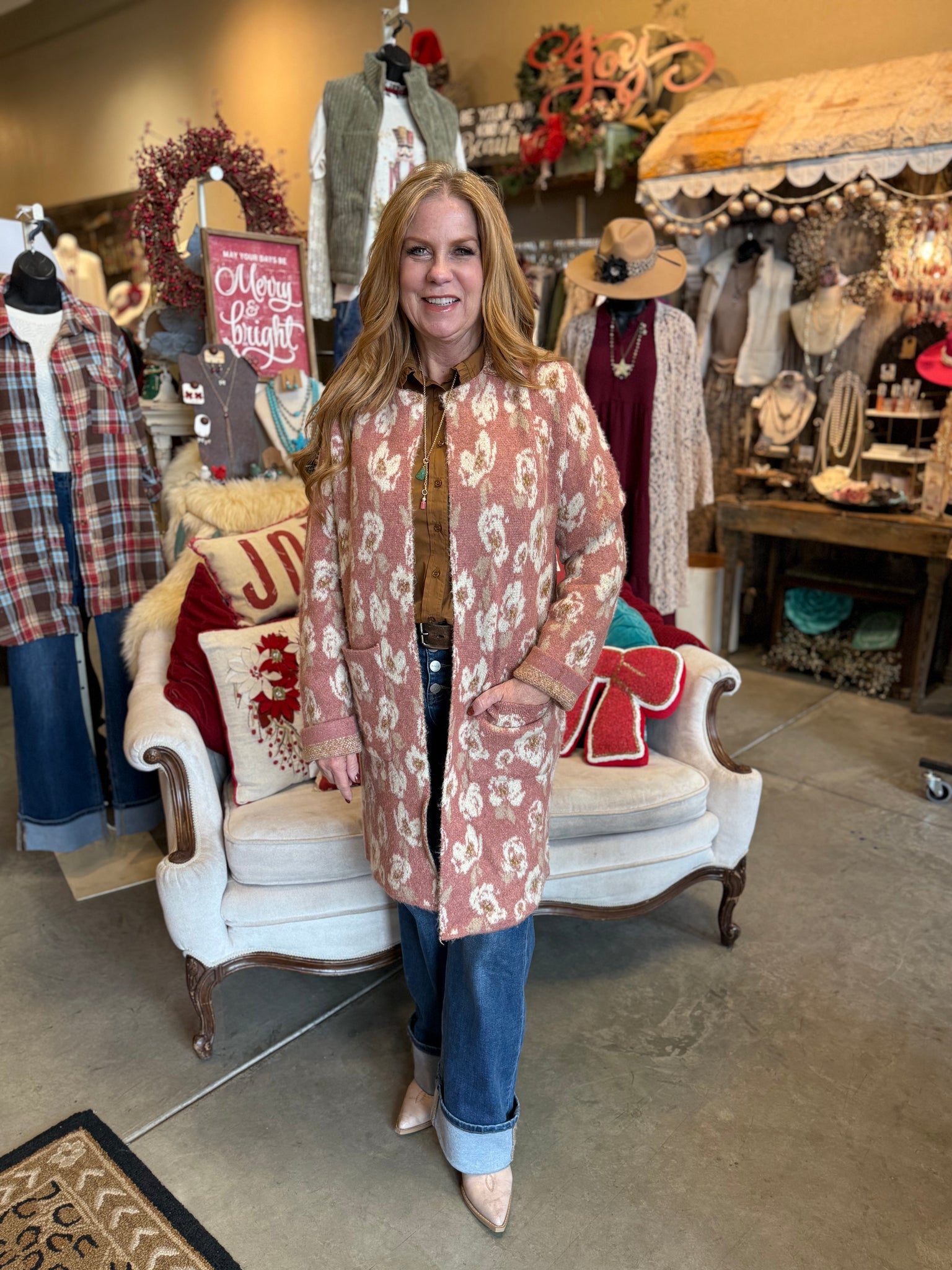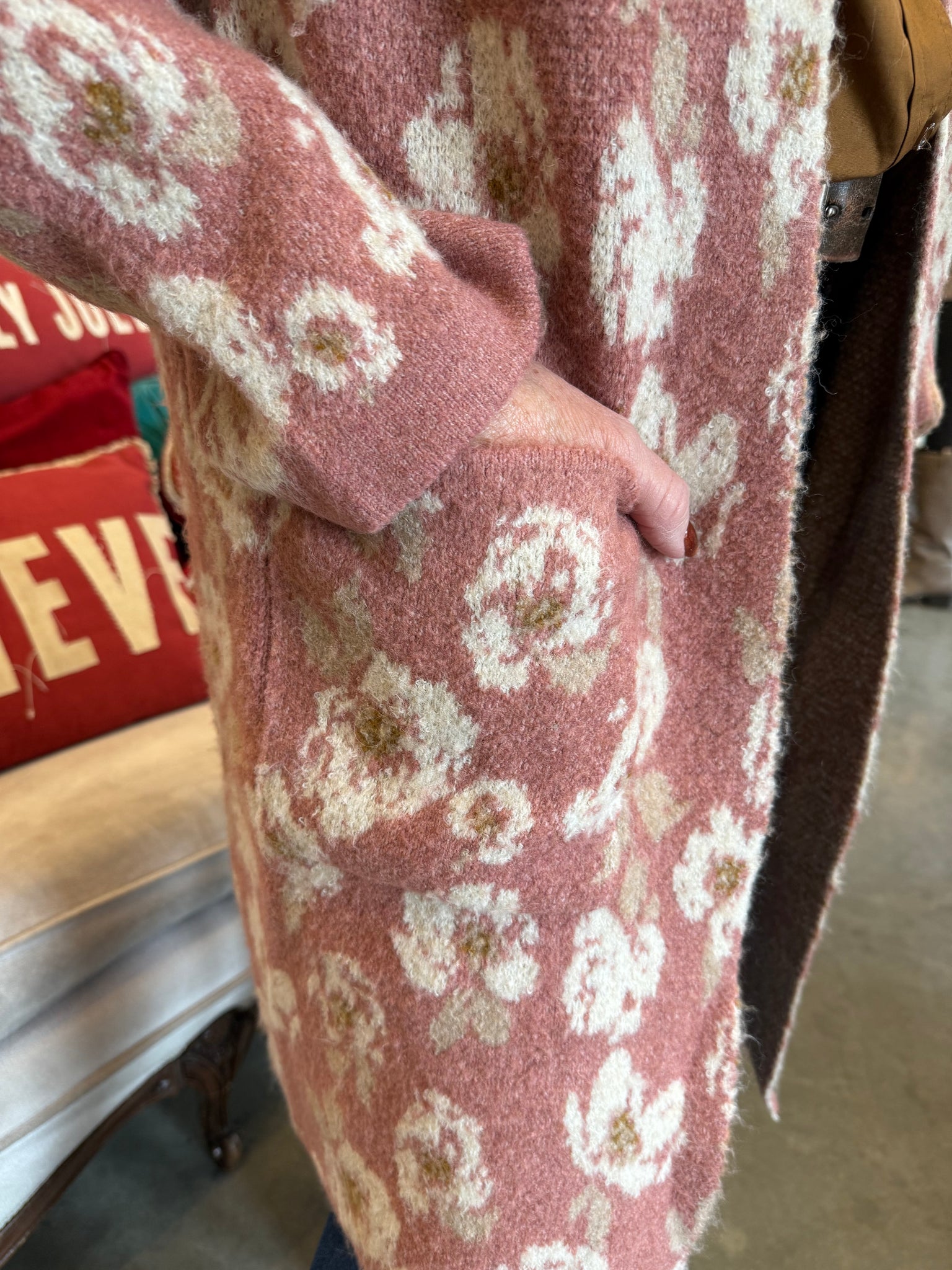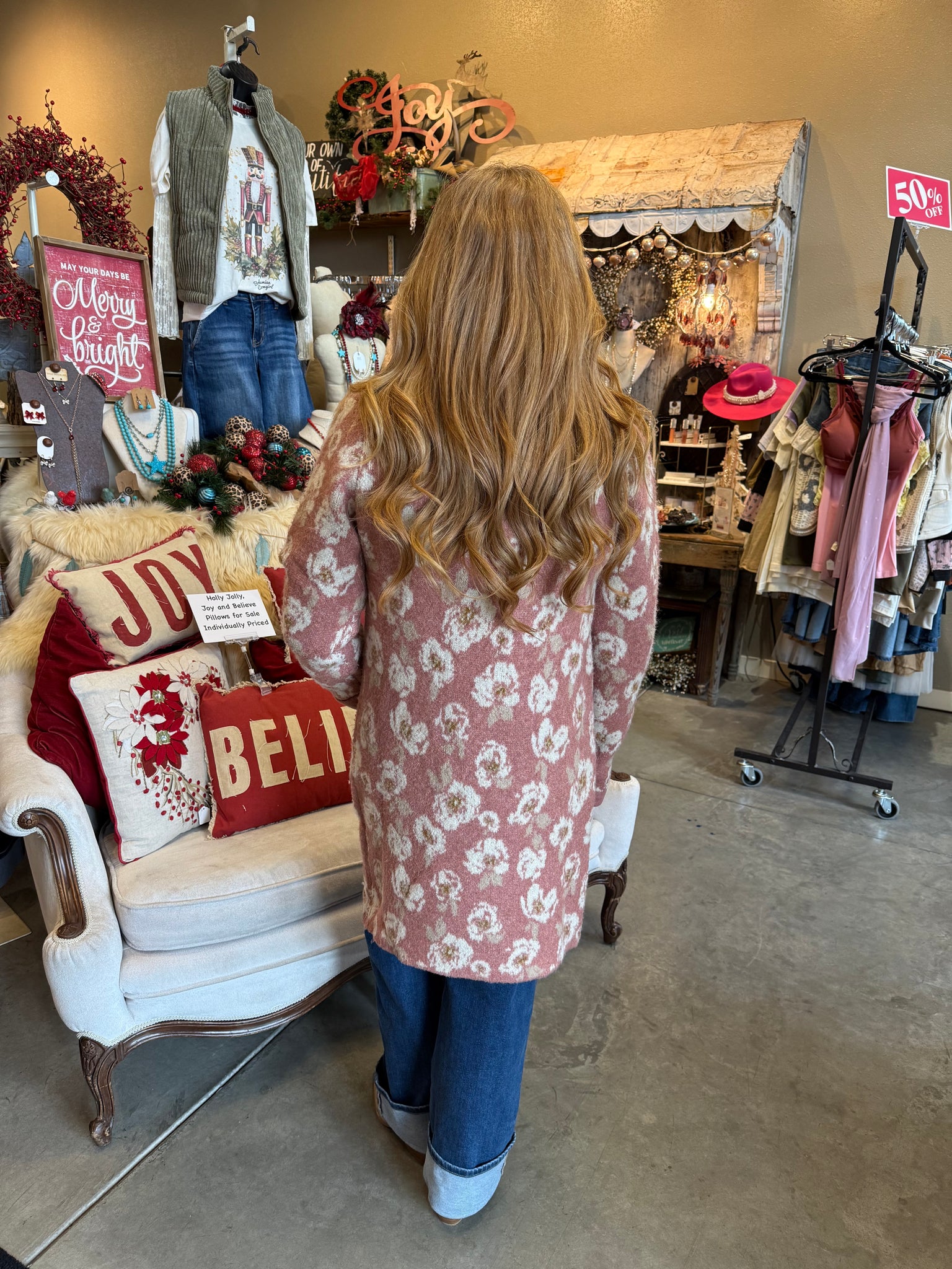 Elevate your seasonal wardrobe with this sophisticated pink sweater coat, featuring an elegant floral print that captures effortless style. The contrasting liner adds visual interest and practical layering versatility, while strategically placed front patch pockets deliver functional design. Crafted from sumptuous, soft materials, this piece provides the warmth you need without compromising on comfort. Perfect for transitional weather, it pairs seamlessly with both casual and refined ensembles, making it an essential addition to any discerning closet.