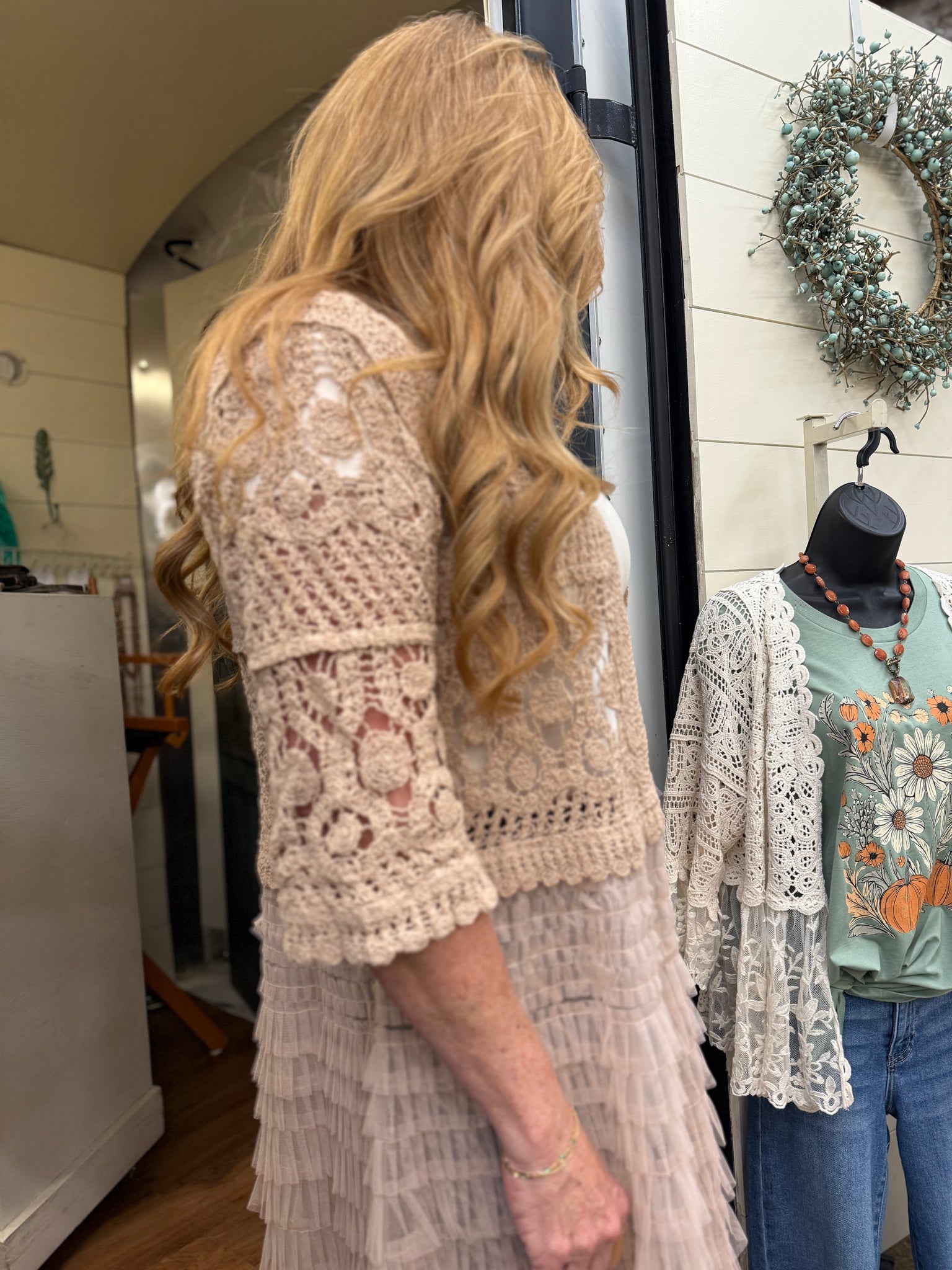 This taupe crochet cardigan with a mesh tiered layer combines playful texture and bold style. Its whimsical design makes a daring statement while adding a flirty touch to your outfit. Perfect for standing out with effortless charm.