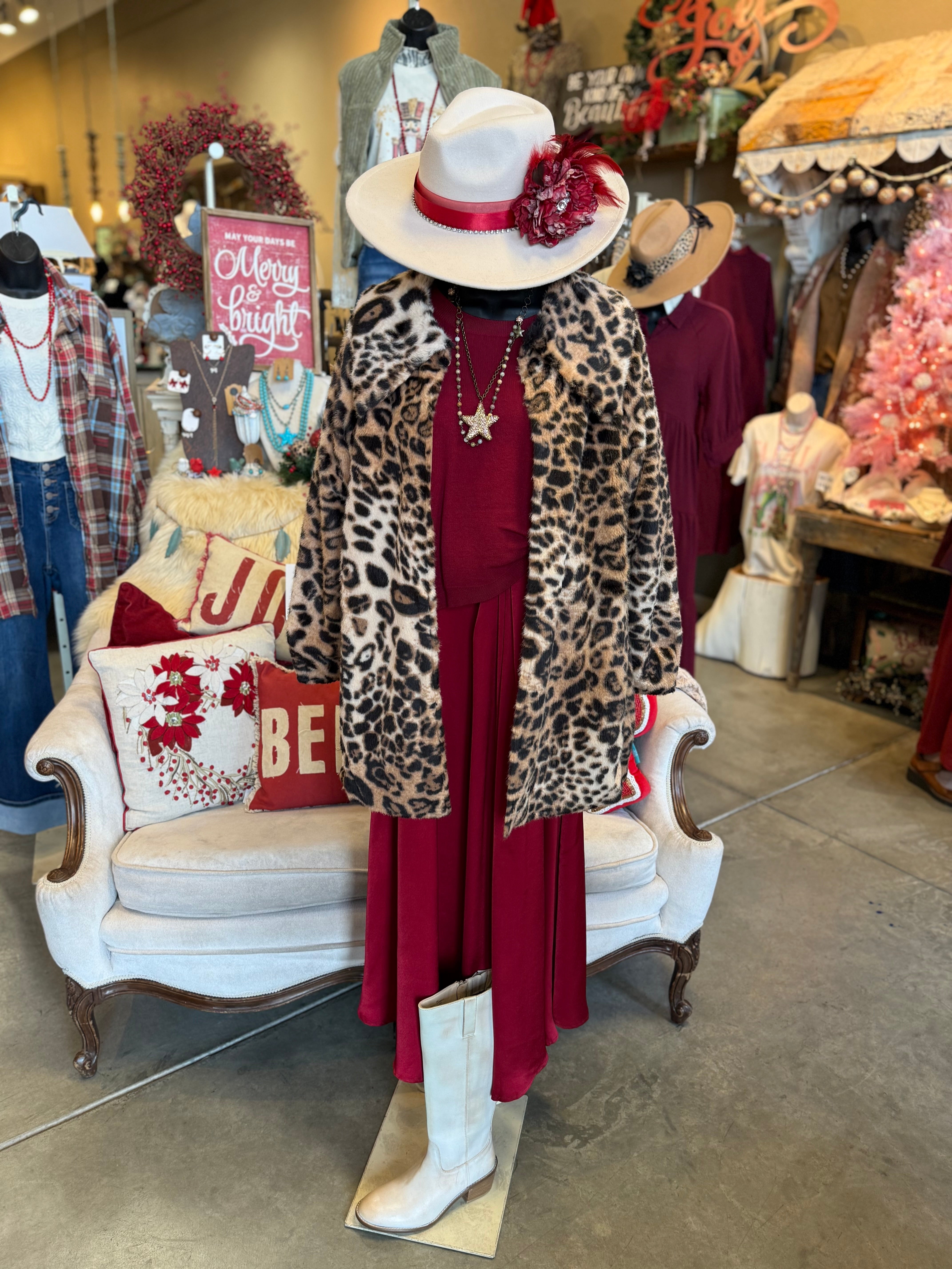 Embrace effortless elegance with this burgundy long sleeve sweater and dress set, designed to celebrate your unique silhouette. The thoughtfully placed side cinch detail creates a flattering shape that hugs you in all the right places, offering both comfort and style.  The dress has great flow and drapes beautifully.  Rich burgundy tones are stunning and festive. When dressing up for a special occasion, this set delivers a polished look that makes you feel confident and put-together.