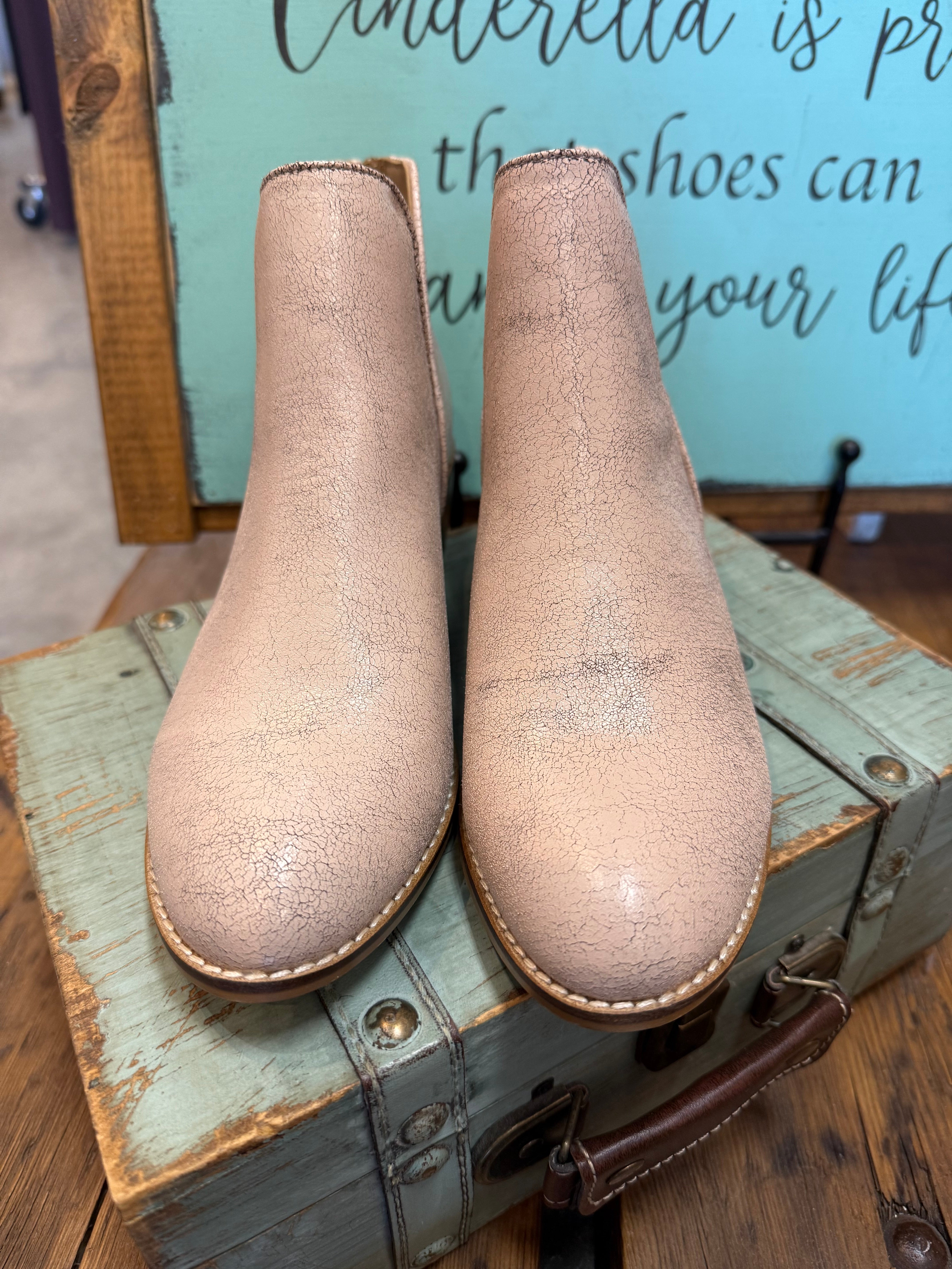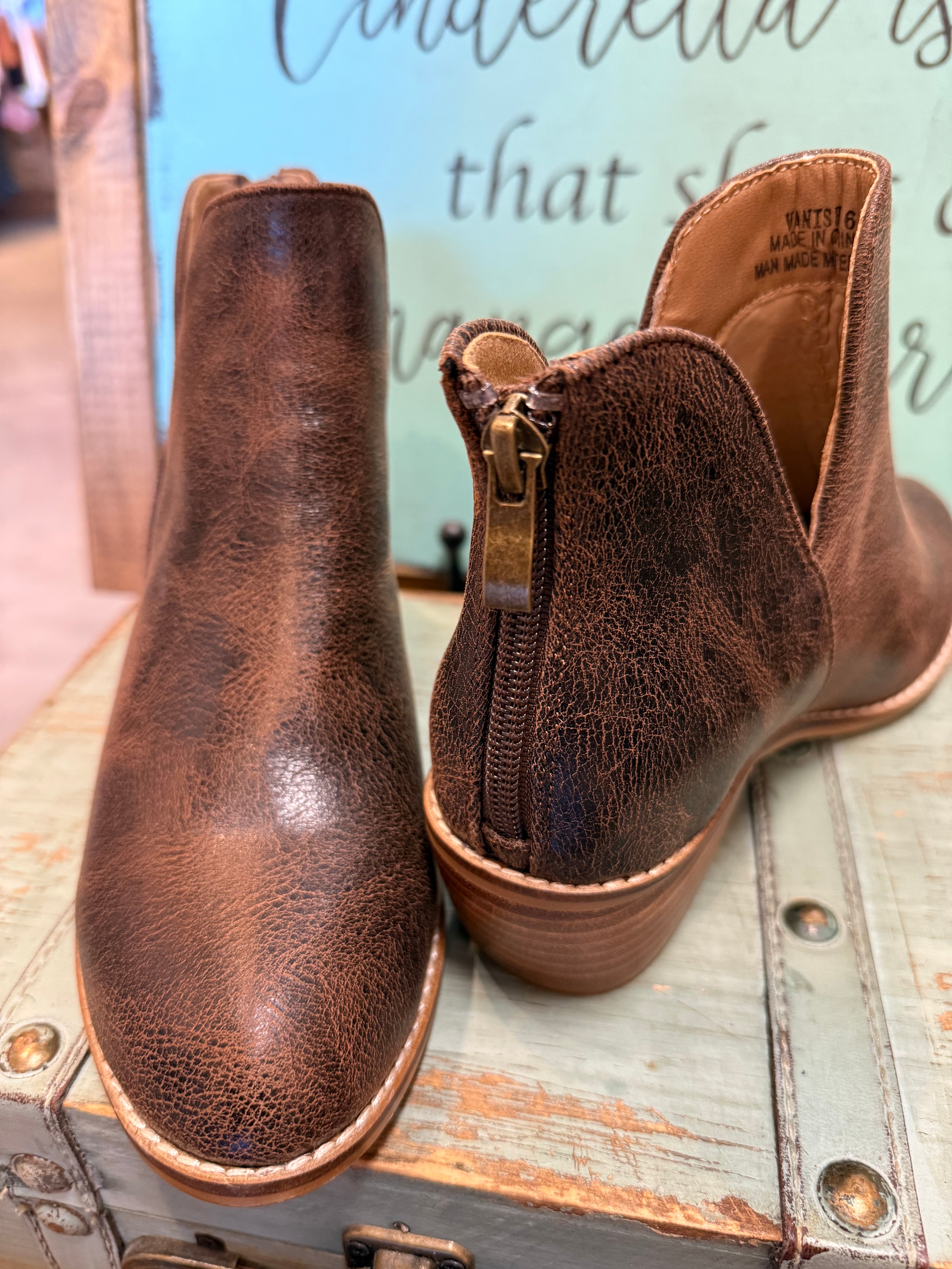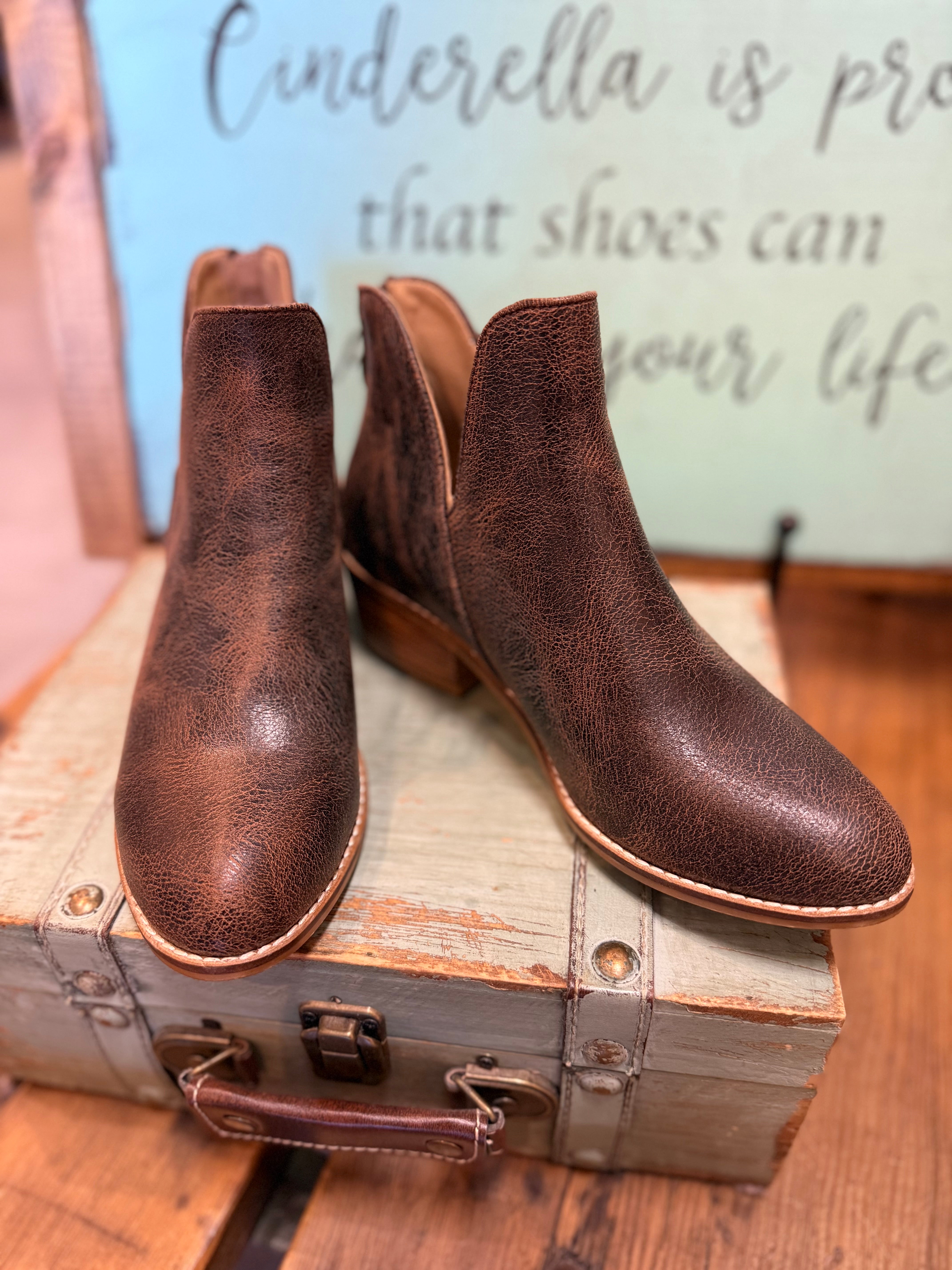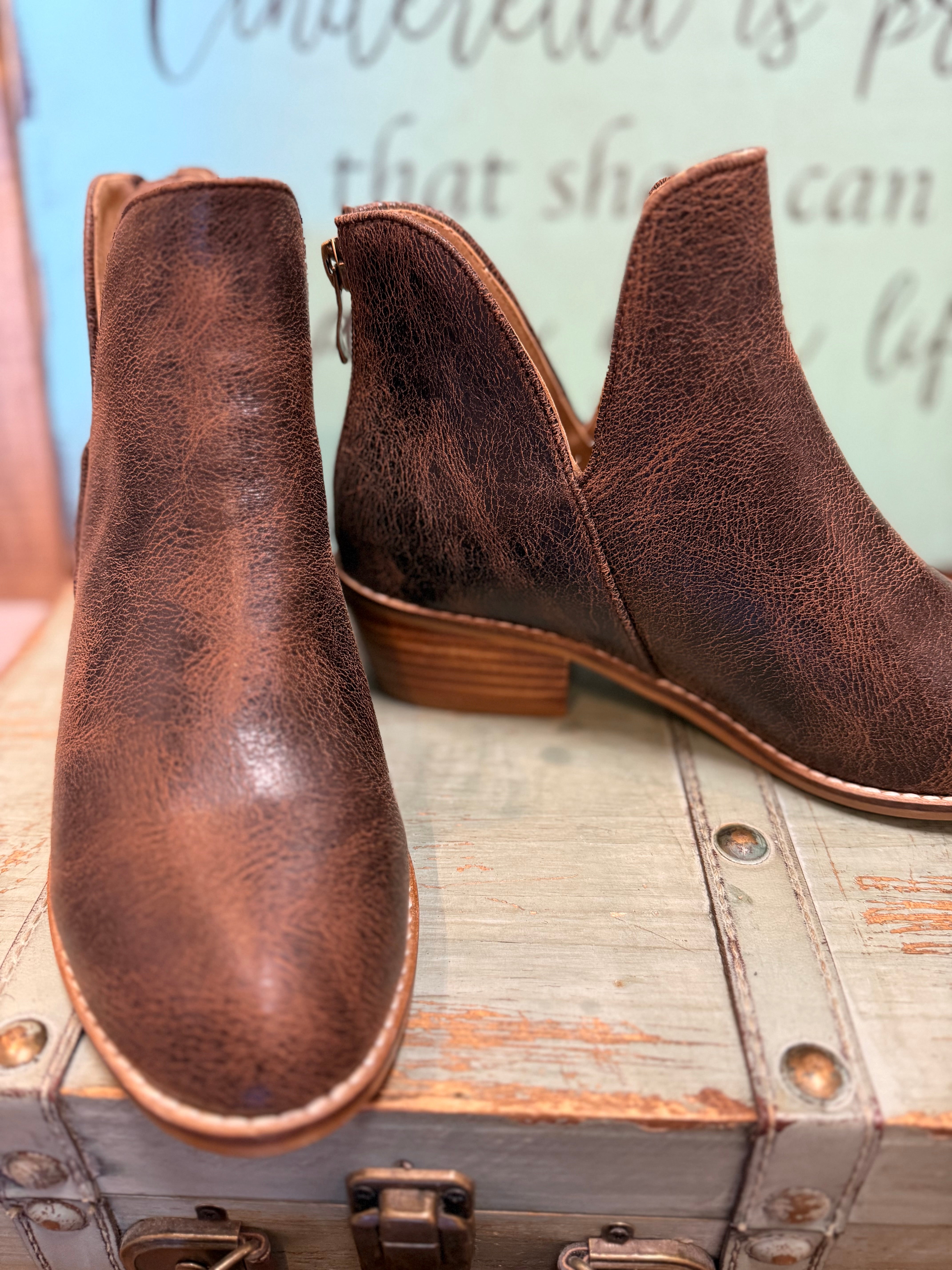 Step out in style with the Corkys Vanish Bootie in Espresso Crinkle. or Cream. Its chic crinkle finish adds an edgy flair, while the back zipper offers easy slip-on convenience. The low heel makes it perfect for all-day wear, effortlessly pairing with any outfit. Available in whole sizes only, these booties bring playful sophistication to your wardrobe.