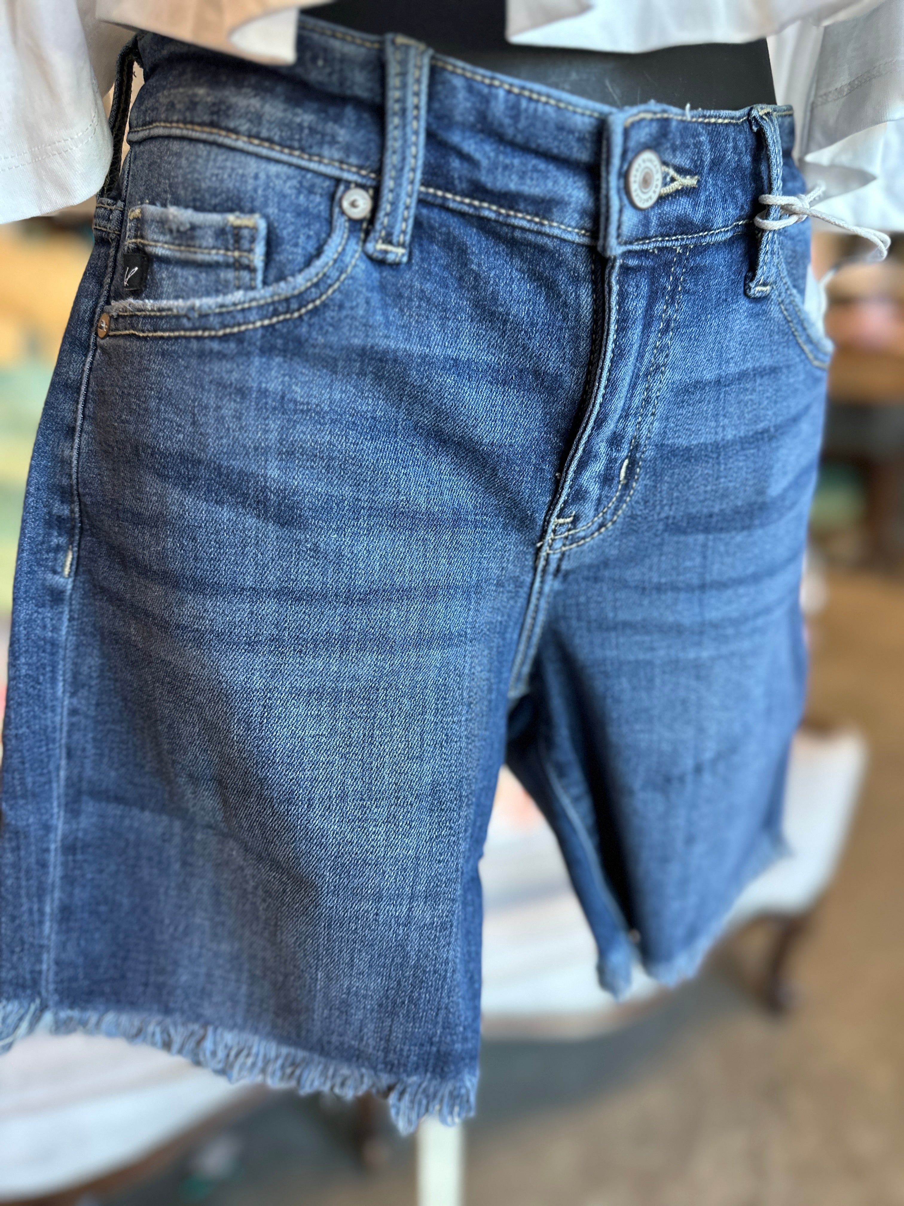 Upgrade your denim game with the Kancan Denim Fringe Short. The dark wash, slight distressed and fringed hem provide an edgy yet timeless look. With added comfort stretch, these shorts are basic but oh so good. Say yes to effortless style with these must-have shorts!