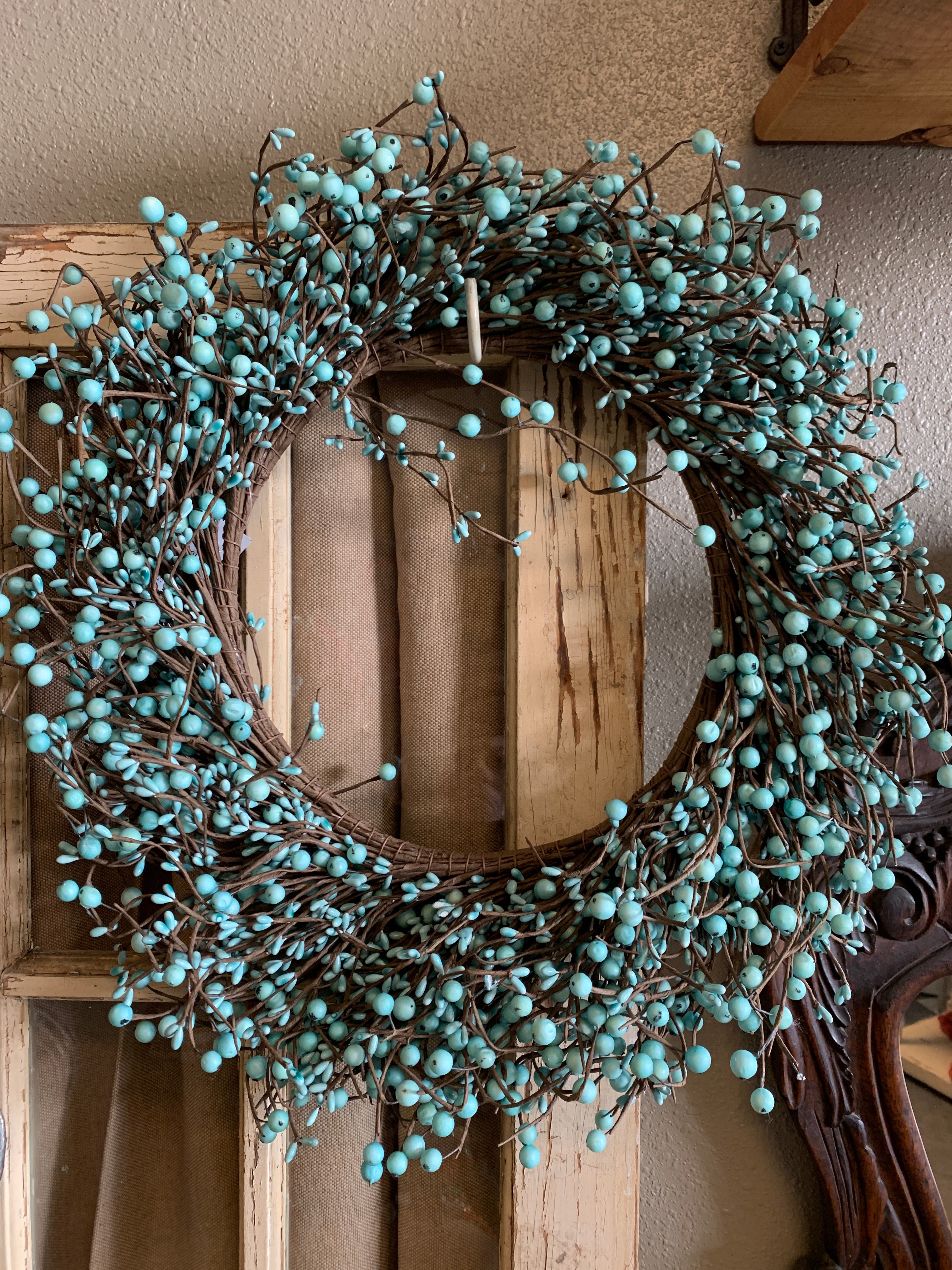 TURQUOISE, CREAM, BROWN OR SUNSET ORANGE MIXED BERRY WEATH IN 19 INCH DIAMETER.