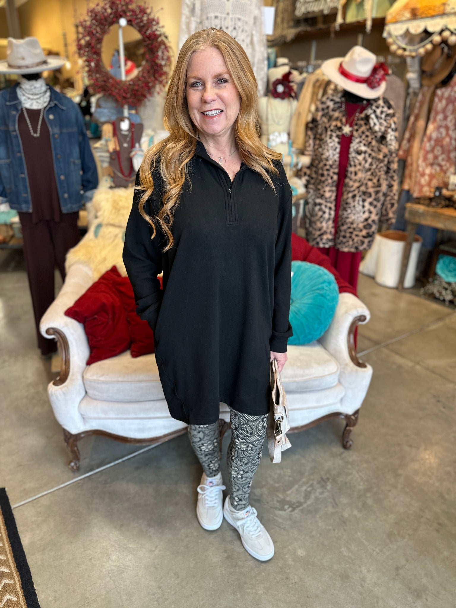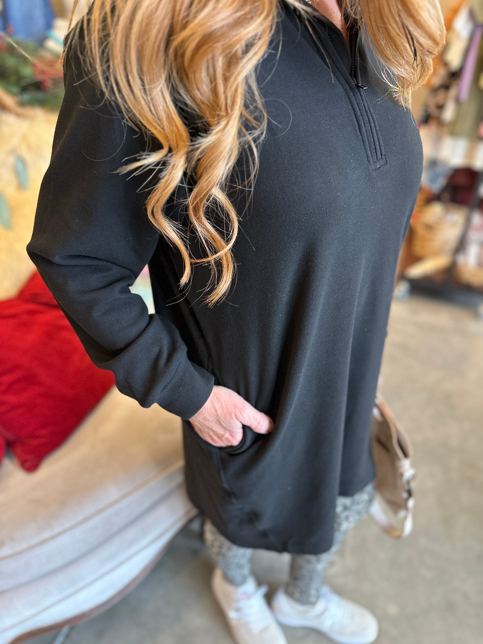 Slip into effortless style with this black quarter-zip brush jersey lounger. Whether you're styling it as a cozy top, relaxed dress, or oversized tunic, this versatile piece adapts to your mood and moment. The soft brush jersey fabric feels amazing against your skin, while the quarter-zip detail adds just the right touch of casual sophistication. Perfect for layering, lounging, or running errands—this is the kind of piece that becomes an instant favorite in your rotation.