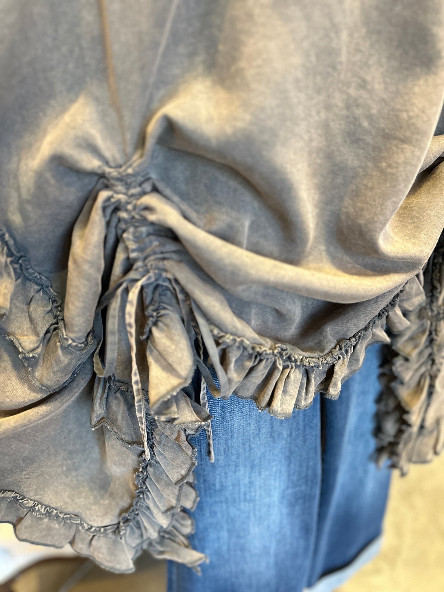 Embrace effortless edge with this mineral-washed charcoal poncho top that commands attention. Crafted from luxuriously soft 100% Tencel, it drapes with an understated coolness that feels both rebellious and refined. A playful side ruffle cinched with an adjustable drawstring adds unexpected movement and attitude—perfect for those who refuse to blend in. Flirty yet fearless, this piece transforms any outfit into a bold statement.