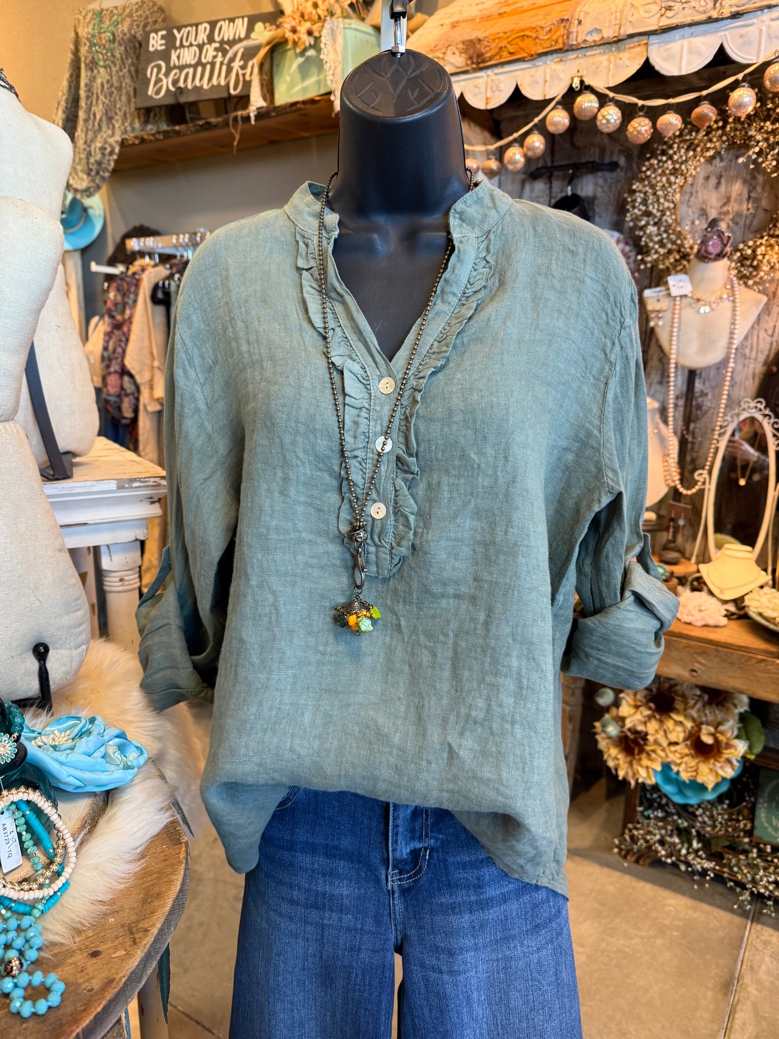 Elevate your wardrobe with this playful linen blouse, available in Beige, Black, Camel or Khaki. Featuring long sleeves with convenient tab buttons, you can easily switch up your look by rolling them up. The unique ruffle neckline is accented with three charming buttons, adding a flirty touch. Its longer length makes it perfect for wearing tucked in or flowing loose, giving you versatile styling options for any occasion.