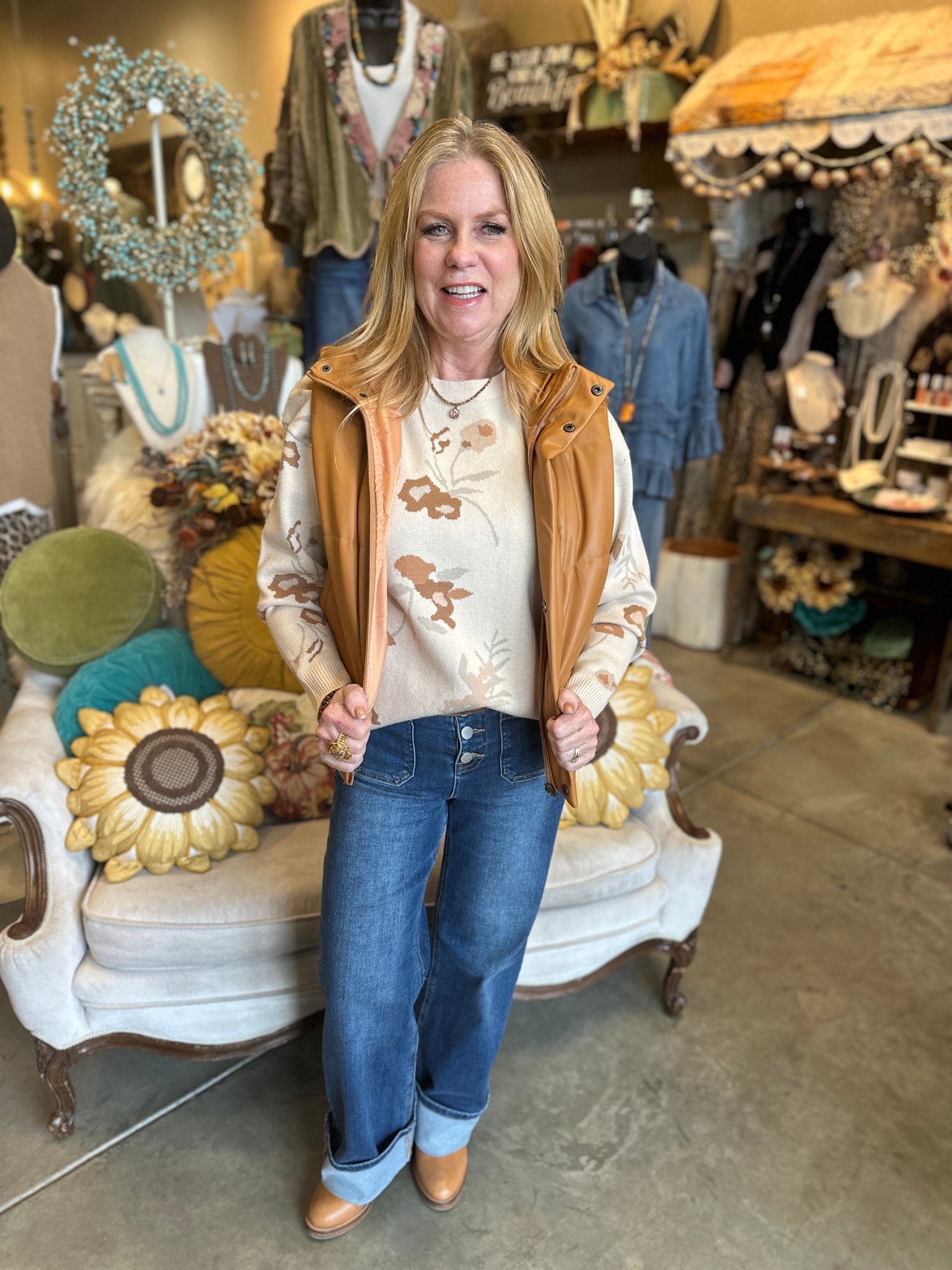 Wrap yourself in cozy comfort with this oatmeal-colored sweater, beautifully accented by a delicate dusty rose and rust floral jacquard pattern. Its soft fabric feels gentle against your skin, making it perfect for layering on cooler days. This versatile piece effortlessly elevates your casual wardrobe with a touch of subtle elegance.