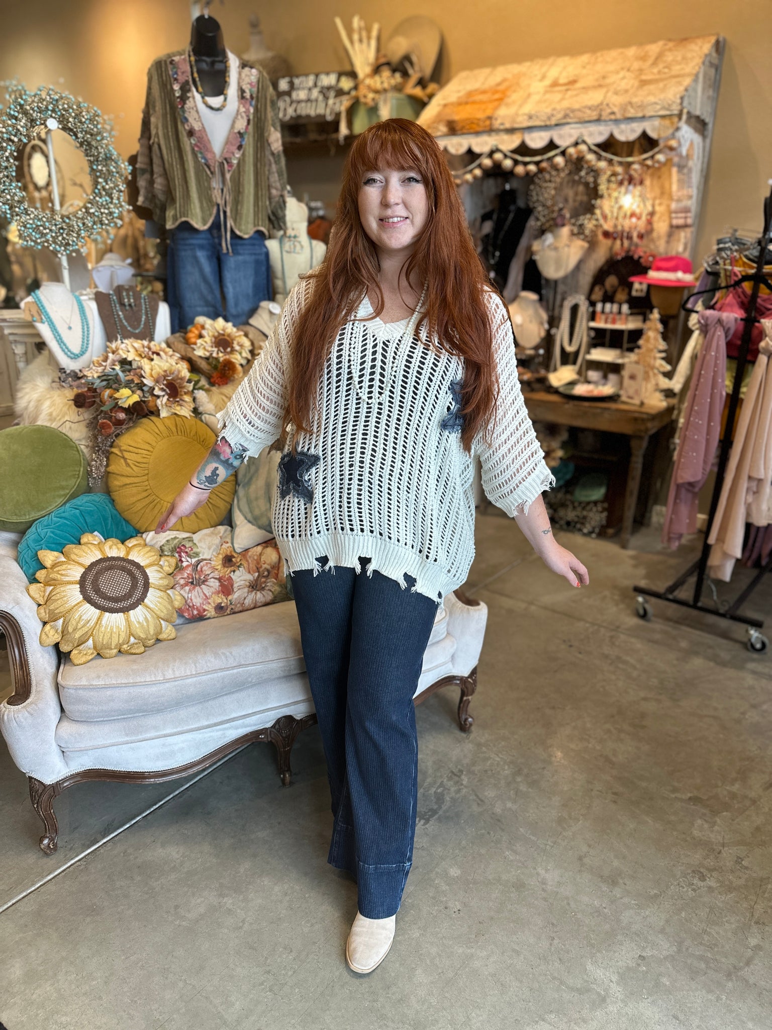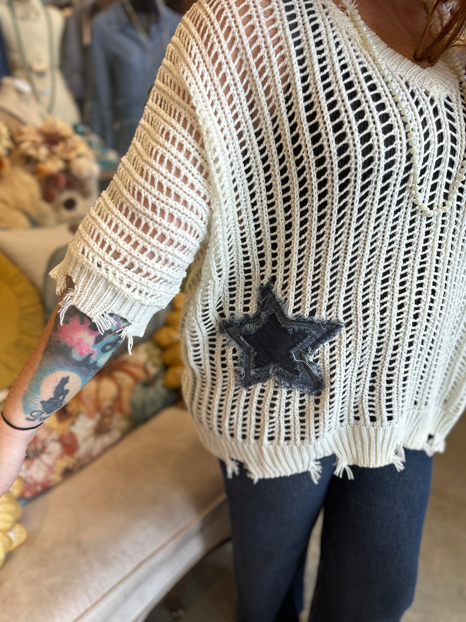 This off-white open knit crochet sweater brings a fun twist to your wardrobe with its playful denim star patchwork details. Its loose fit keeps you cozy and casual, perfect for layering and relaxed days. Stay on trend while adding a touch of handmade charm to any outfit.