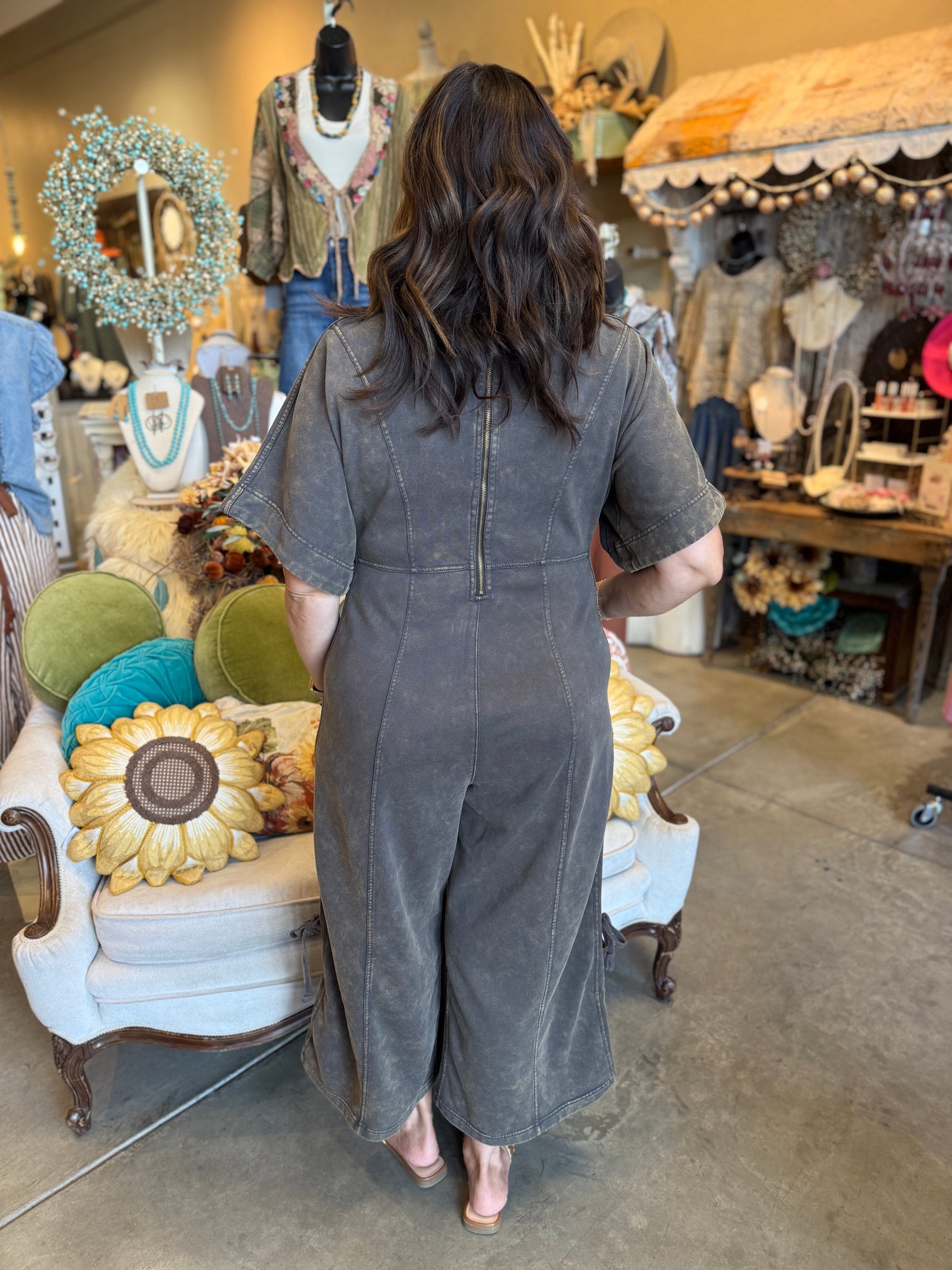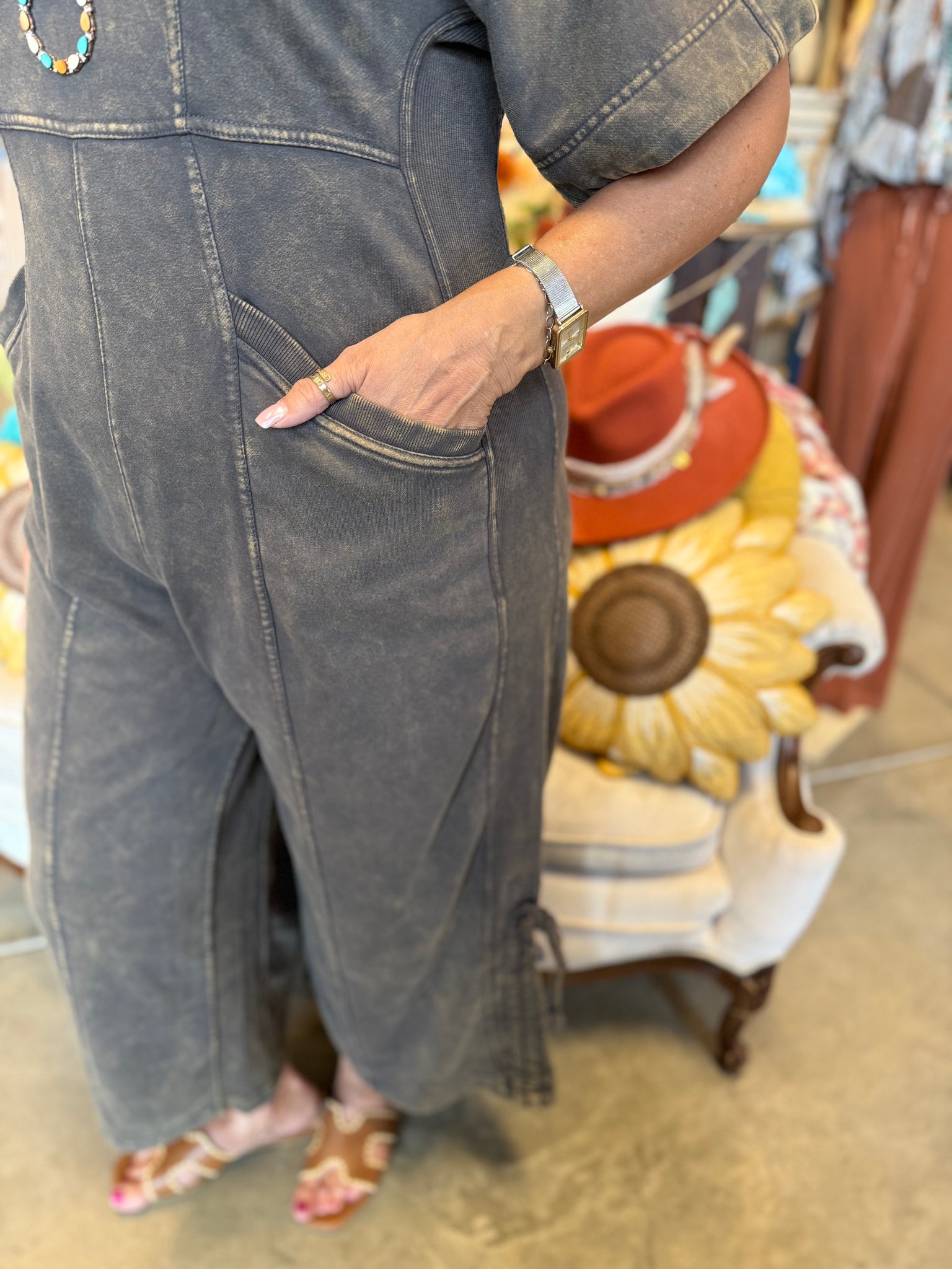 This ash black mineral-washed jumpsuit is your new go-to for any vibe. With a flattering V-neck, easy back zipper, and adjustable drawstring hems, it’s built for comfort and style. Pockets keep your essentials handy whether you’re kicking back or hitting the town. Dress it up or down—this one-of-a-kind piece adapts to your mood effortlessly.
