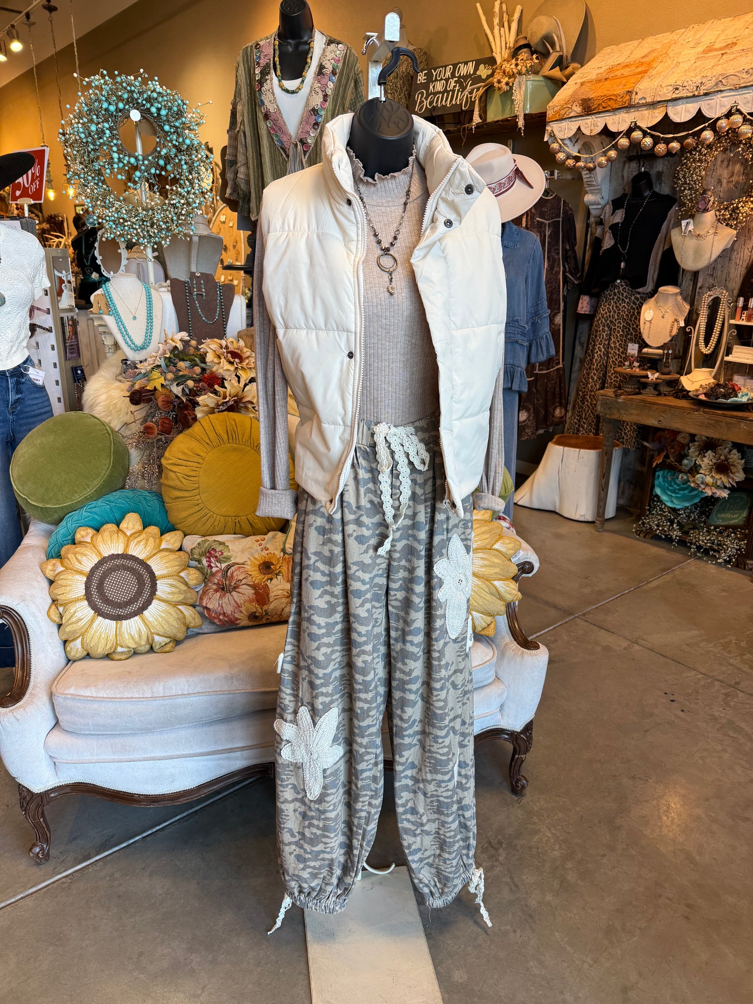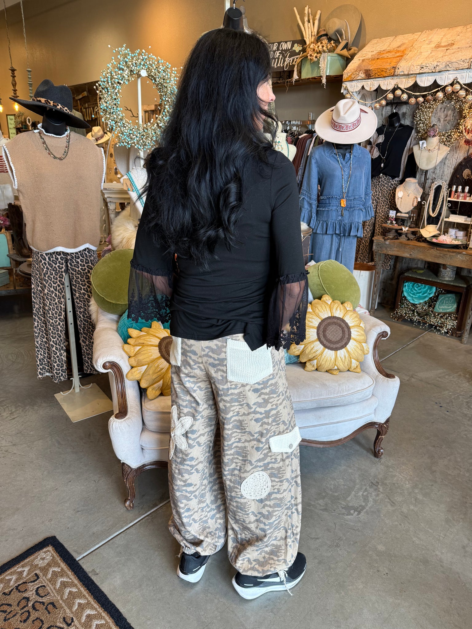 These Beige Camo Pants bring a fun twist to classic camo with a soft beige palette designed to help you stand out for all the right reasons. Featuring an elasticized waist and hem for ultimate comfort, they’re accented with charming crochet drawstrings and delightful daisy crochet patches that add a playful, unique touch to your outfit. Perfect for anyone who loves to mix comfort with a quirky, eye-catching style.