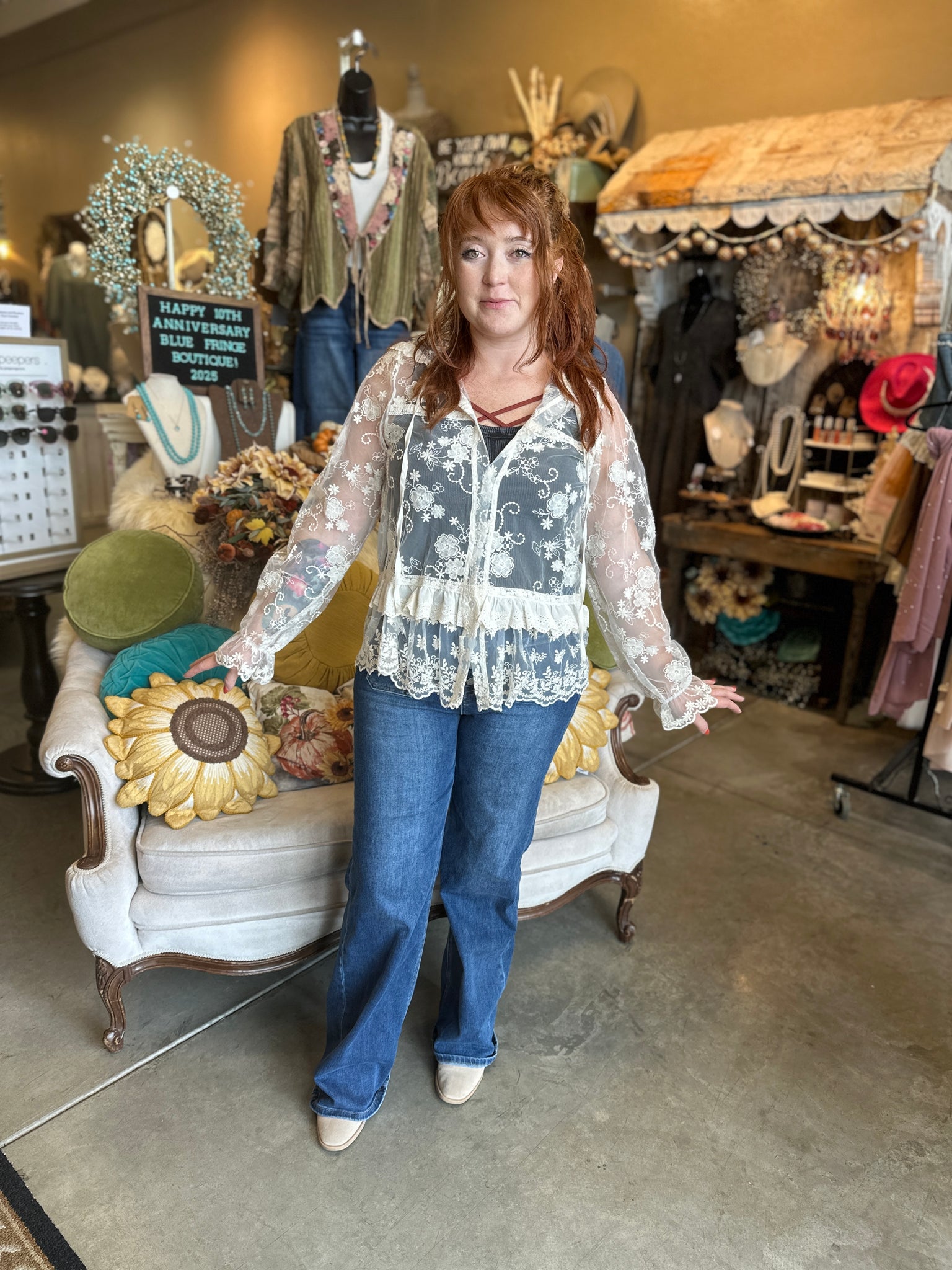 Wrap yourself in delicate charm with this Beige Lace Hoodie. Featuring intricate embroidered lace, playful ruffled accents on the hood and hem, and easy front buttons, it blends comfort with a distinctly feminine touch. Perfect for adding a soft, unique twist to your casual wardrobe.