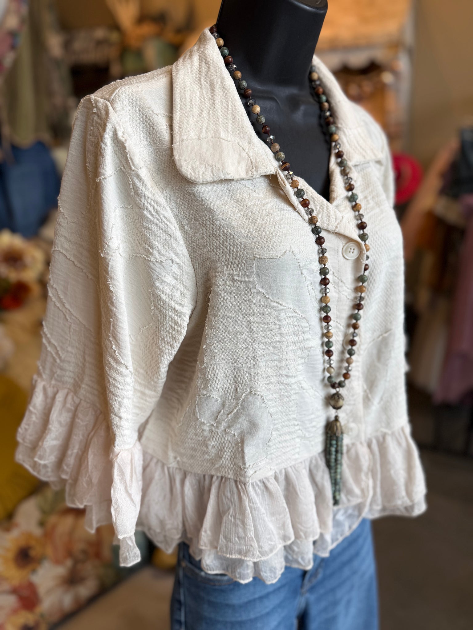Elevate your wardrobe with this beige cropped jacket, featuring delicate embroidery that adds a refined touch. Designed with feminine ruffle accents at the wrists and hem, it offers subtle elegance. Its slightly cropped cut allows versatile styling—wear it open for a relaxed look or buttoned up for a polished finish. Perfect for adding sophistication to any ensemble.