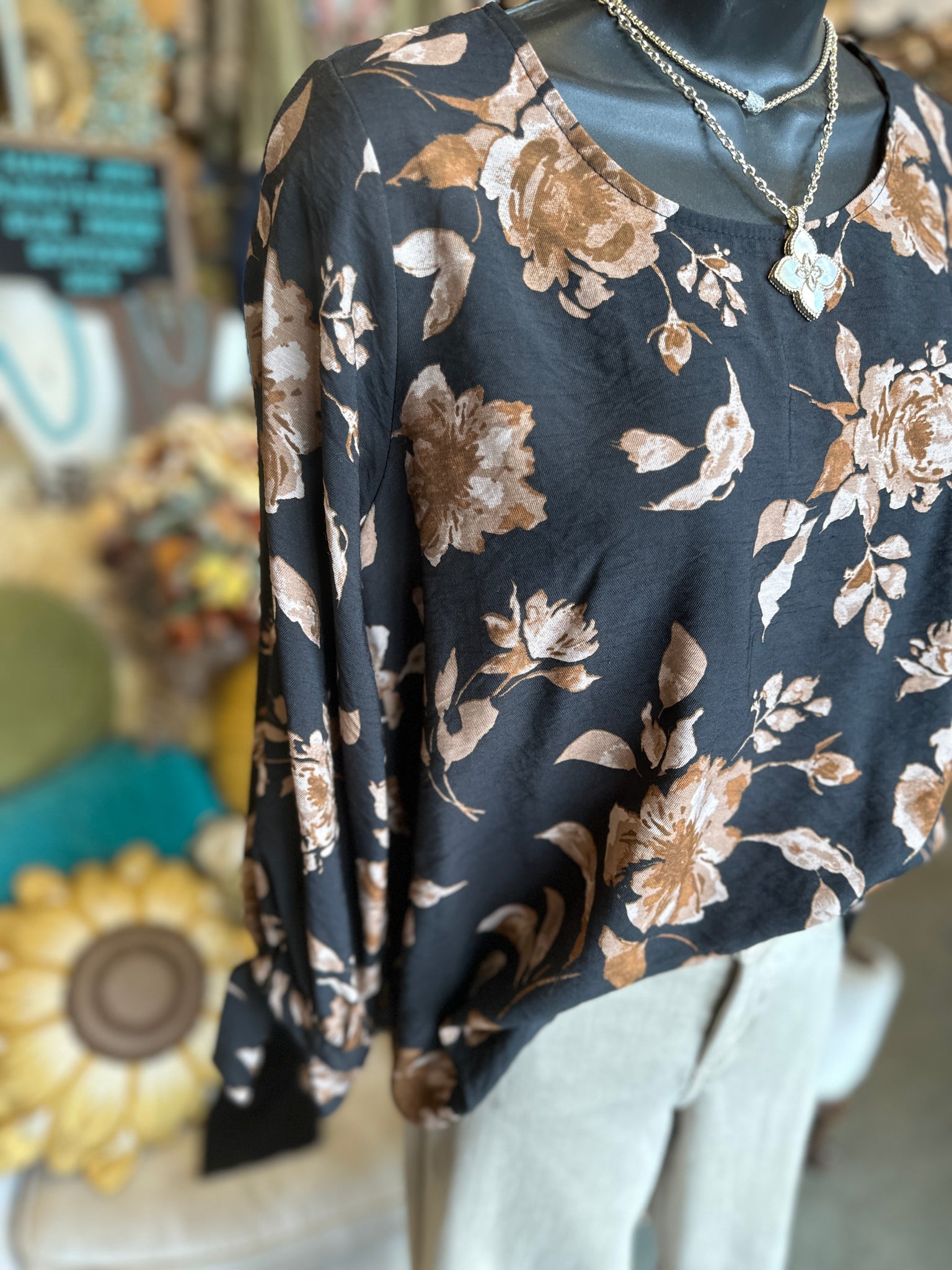 Elevate your wardrobe with this Black and Camel Floral Print Blouse. Its silky texture feels luxurious against the skin, while the scoop neck and elastic sleeves create a flattering, comfortable fit. The elegant drape enhances your silhouette, making it perfect for both casual and dressy occasions. The timeless floral pattern on a deep black background adds a sophisticated touch to your everyday style.