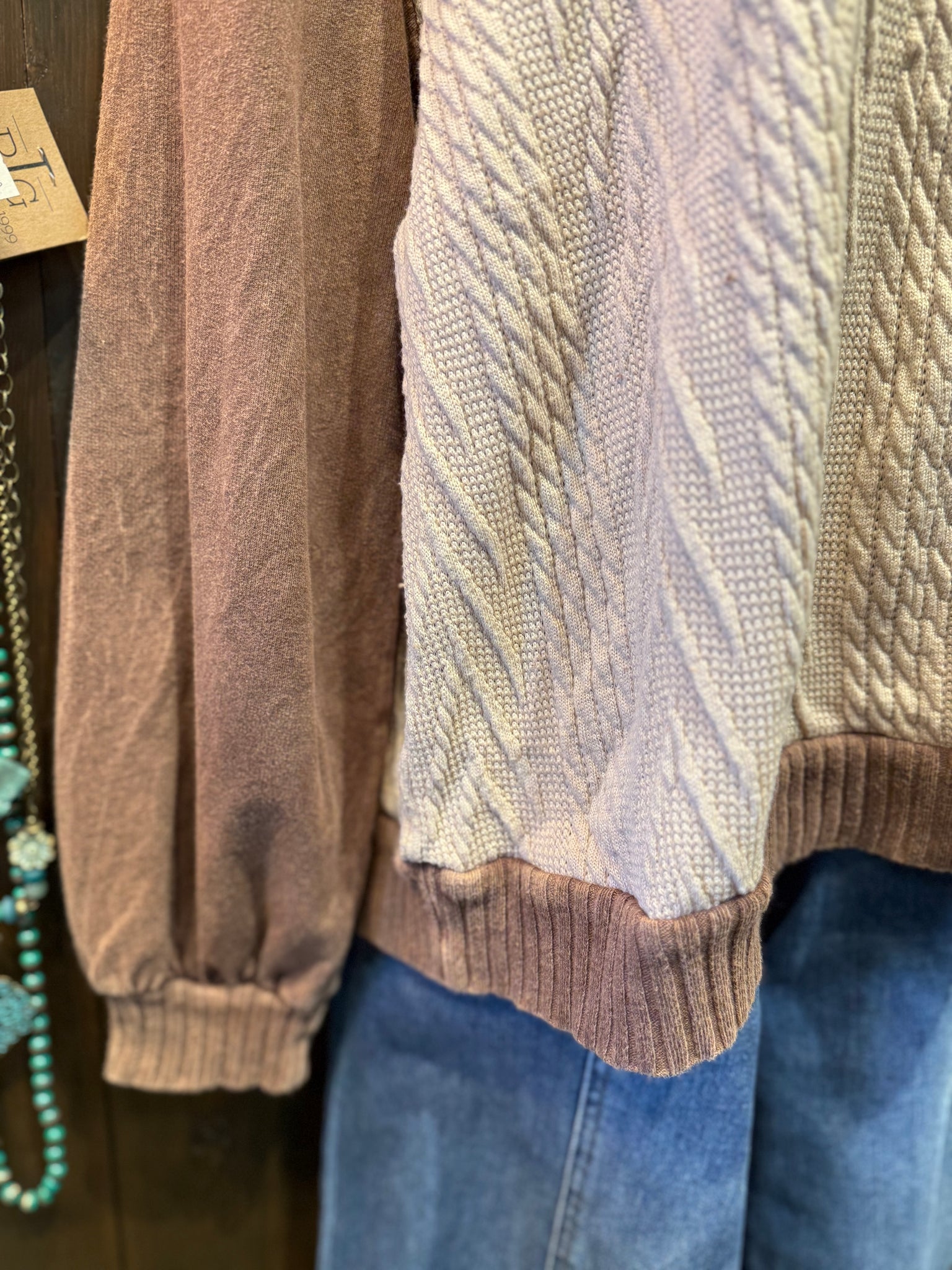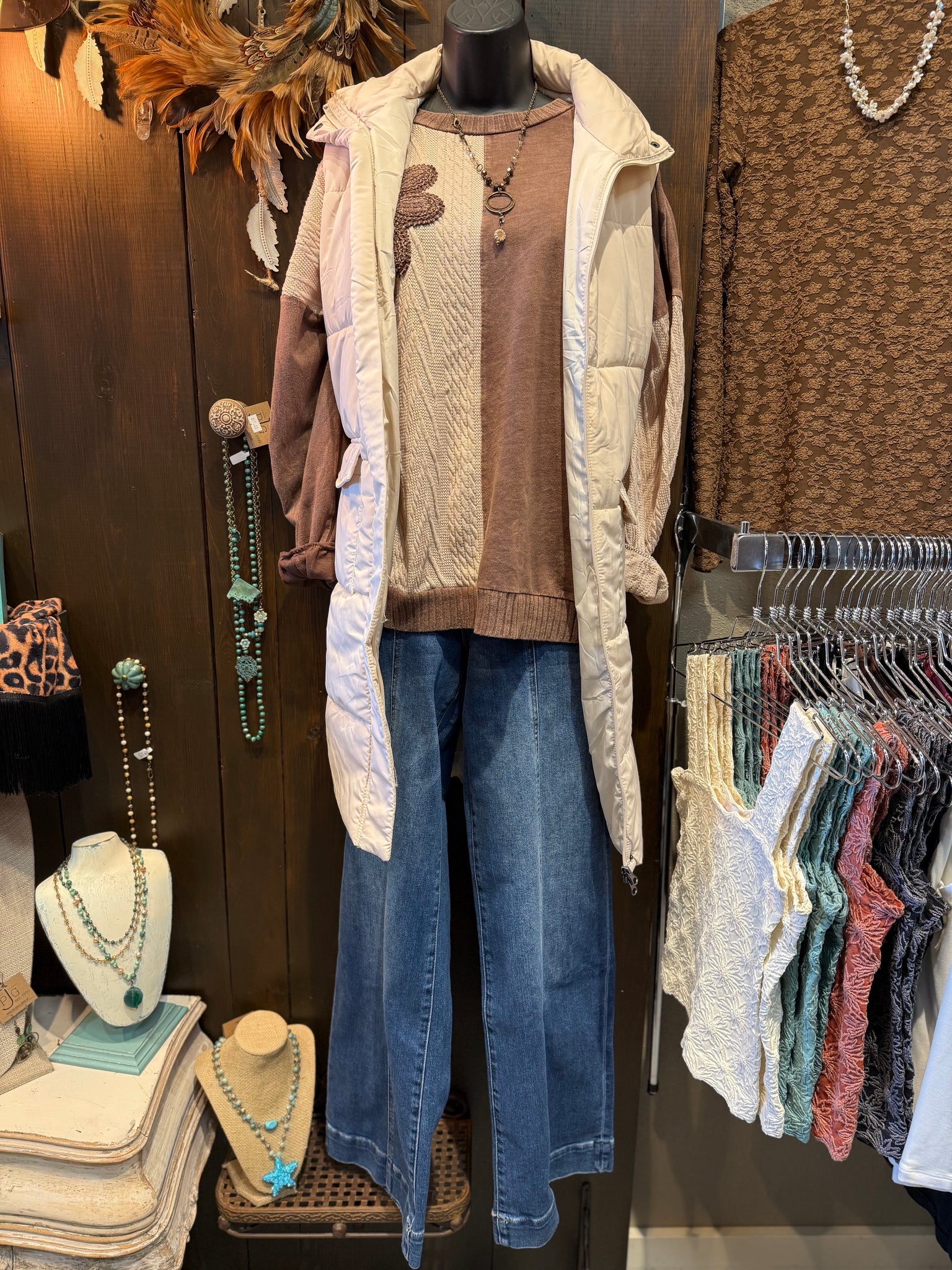 Wrap yourself in cozy charm with this adorable mixed knit sweater combo featuring rich chocolate and creamy vanilla tones. The sweet daisy patch detail adds a whimsical touch that's perfect for expressing your fun side. Crafted for comfort, this piece layers beautifully and feels as good as it looks. Whether you're running errands or meeting friends, you'll love how effortlessly cute and snuggly this sweater makes you feel.