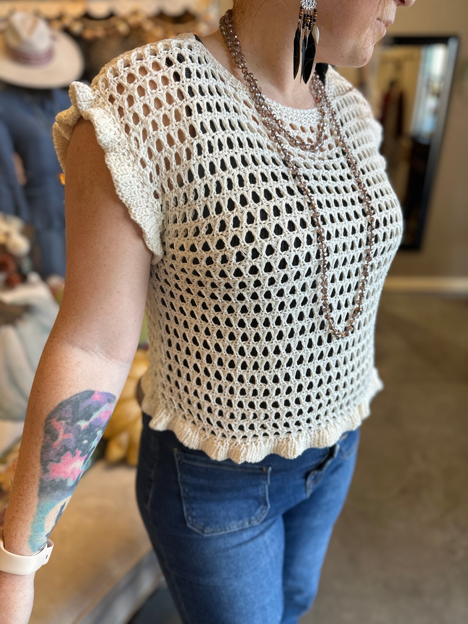 Cream Open Knit Ruffle Sweater