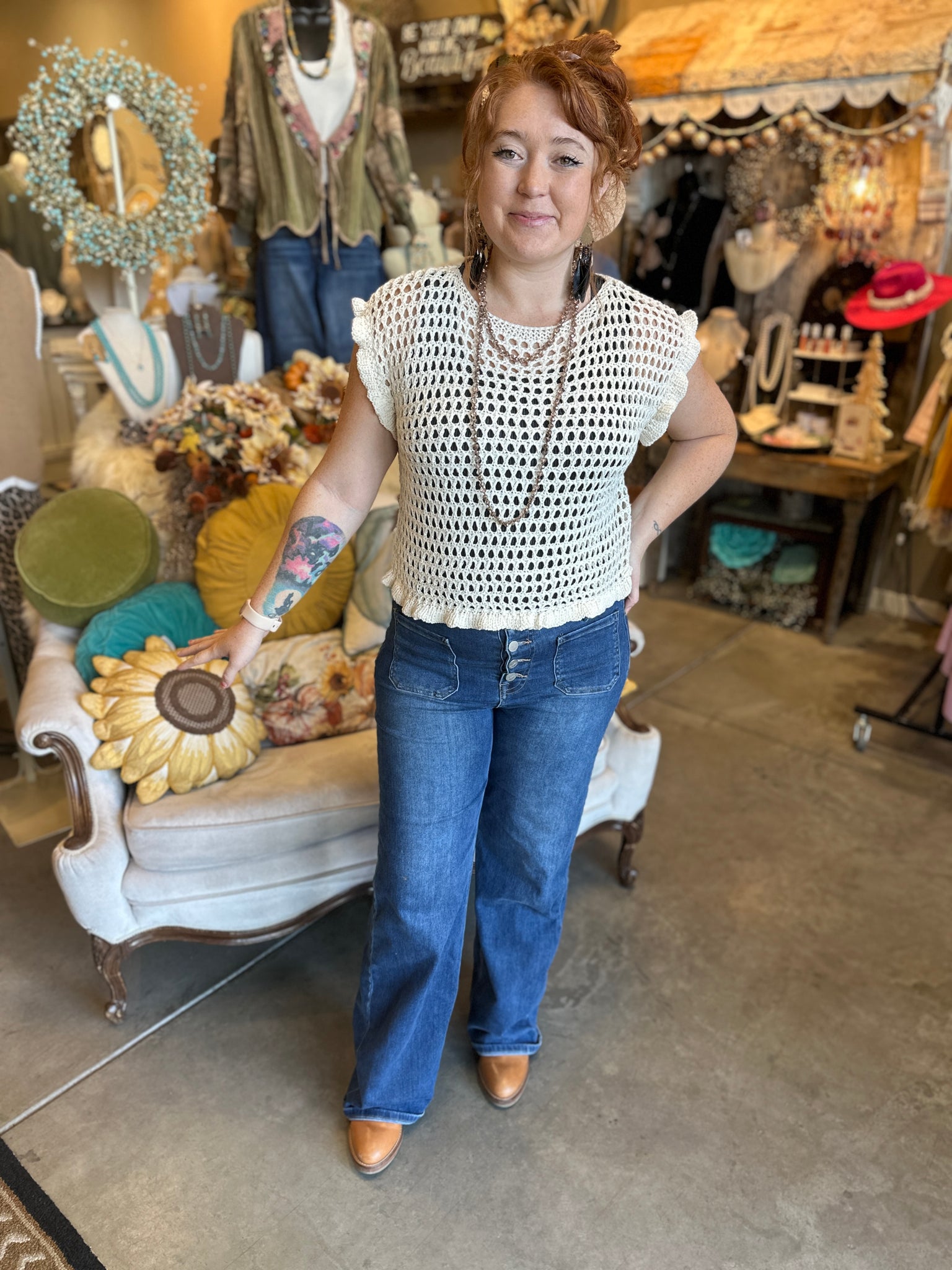 This Cream Open Knit Ruffle Sweater adds a flirty twist to your layering game. Its delicate open knit design pairs perfectly over your favorite tank or lace top, while charming ruffle details on the sleeves and hem keep things fun and fresh. Easy to mix, match, and sass up any outfit!