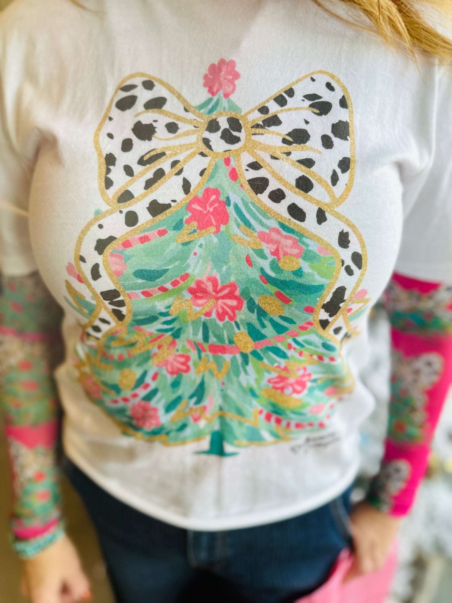 Celebrate the season in style with this festive graphic tee featuring an adorable Christmas tree topped with a chic leopard print bow. The crisp white fabric provides the perfect canvas for this eye-catching design, while the raw hem creates a trendy cropped silhouette that's equal parts cozy and cool. Whether you're trimming the tree or hitting holiday parties, this playful piece brings a touch of wild sophistication to your seasonal wardrobe.