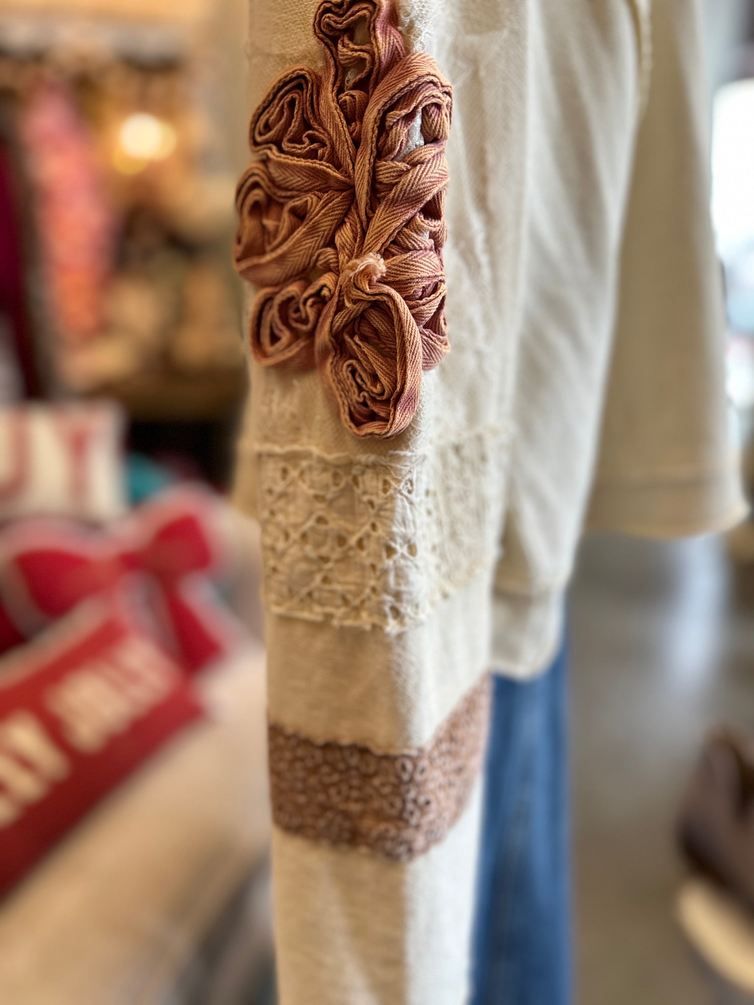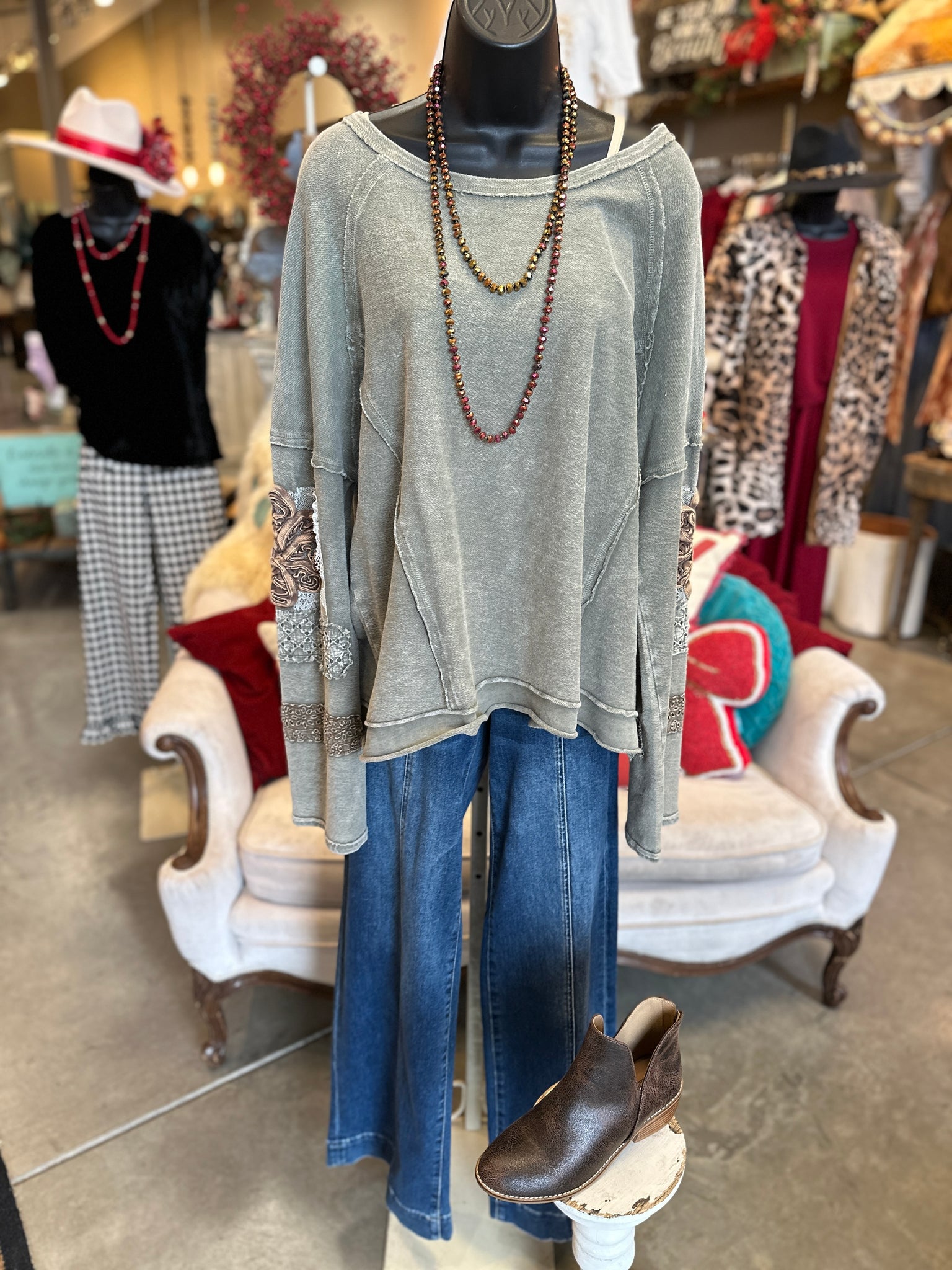 Unleash your inner boho babe with our Natural or Faded Olive Lace Mix Terry Top! The mineral washed terry knit adds a touch of uniqueness while the lace mix details and raw edge seams create a cute and comfortable look. With an oversized fit, this top is perfect for a relaxed and stylish vibe. Get ready to turn heads!