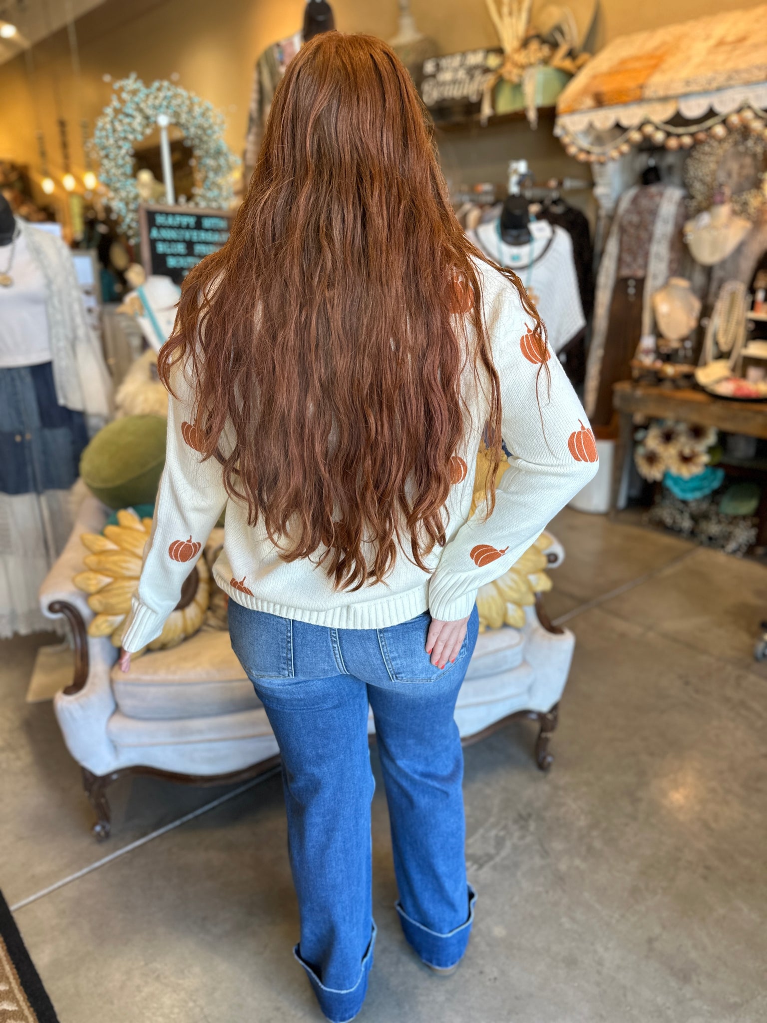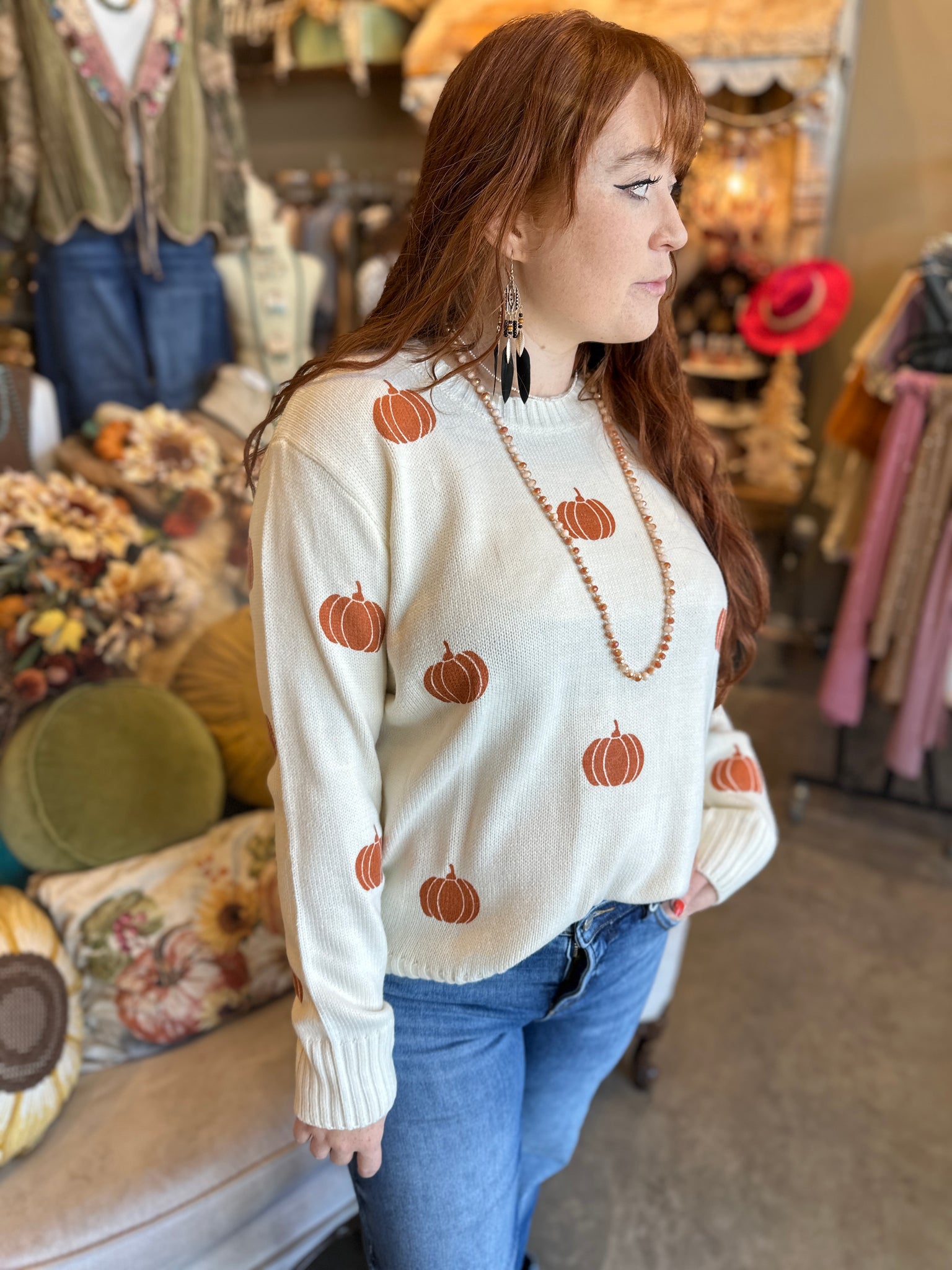 Embrace sweater weather with this adorable cream pumpkin sweater. Soft and cozy, it’s perfect for chilly days and brings a playful touch of autumn to any outfit. Stay comfy and cute all season long!
