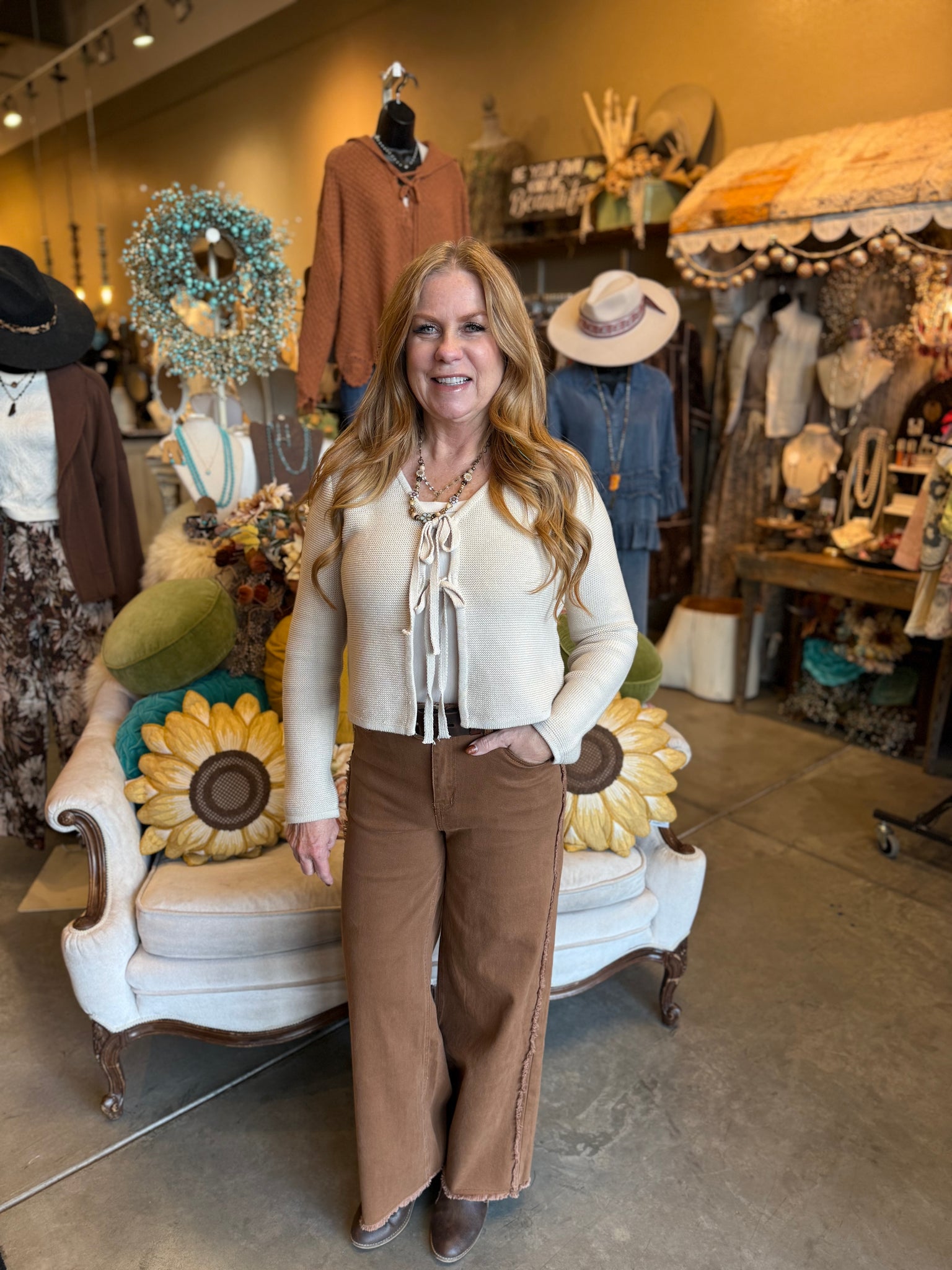 Experience all-day comfort and style with these Rust Twill Pants. Featuring a soft washed fray edge detail and a comfortable stretch fabric, they offer flexibility without sacrificing shape. The elastic waistband ensures a perfect fit, while the high-rise wide-leg cut flatters your silhouette. The warm rust color makes them ideal for embracing Fall’s cozy palette.