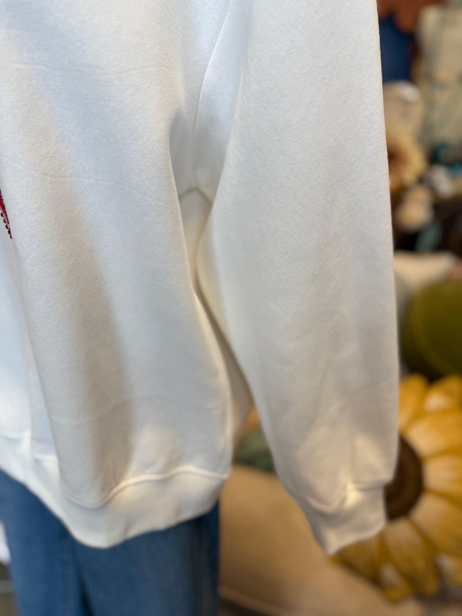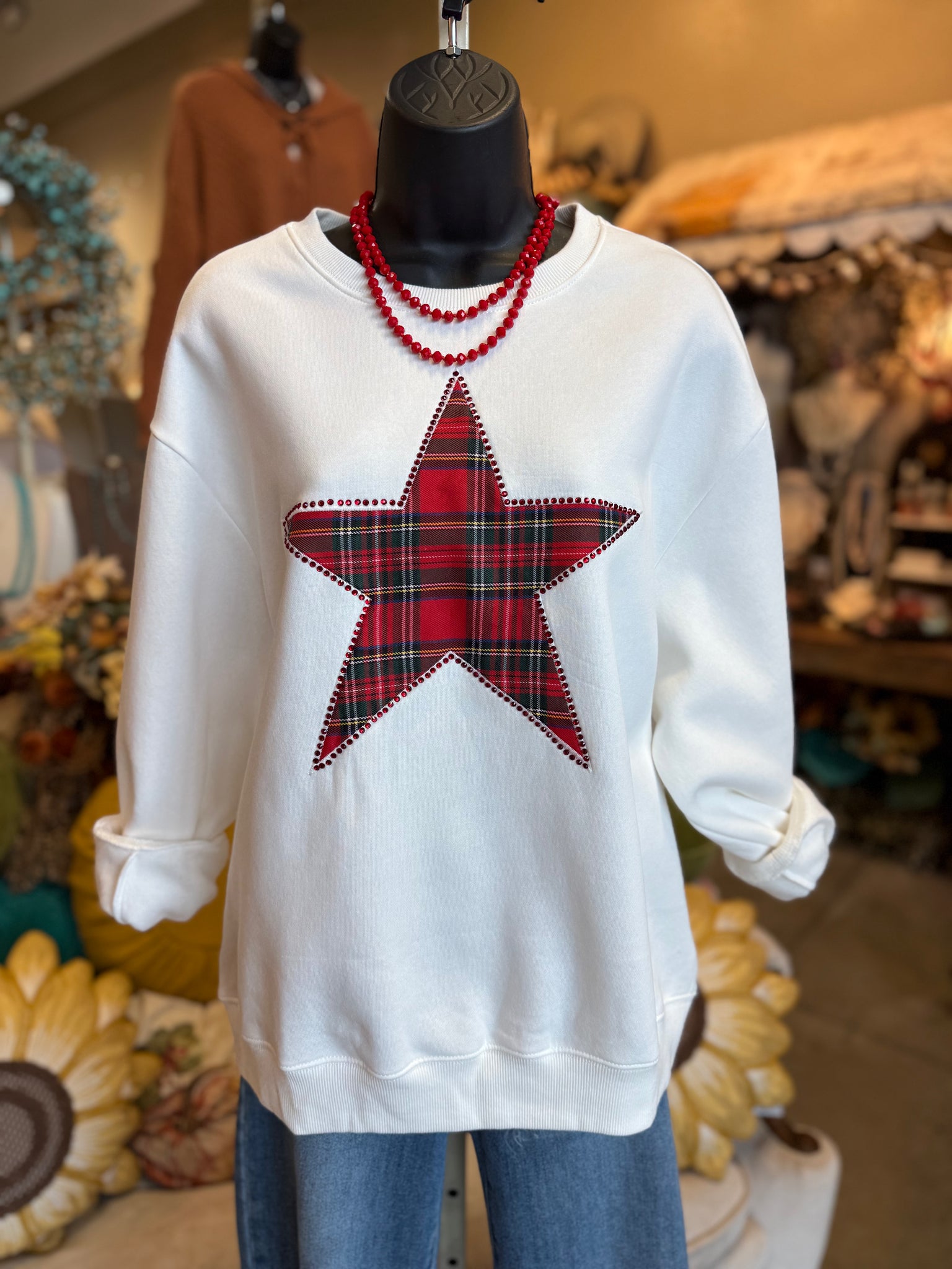 Elevate your seasonal wardrobe with this playful white terry knit top, featuring a charming tartan plaid star patch that's stealing the spotlight this season. The rhinestone-outlined star detail adds just the right amount of sparkle and dimension, making it perfect for mixing with your favorite pieces. Cozy, trendy, and impossible to resist—this top is your new go-to for effortless style.